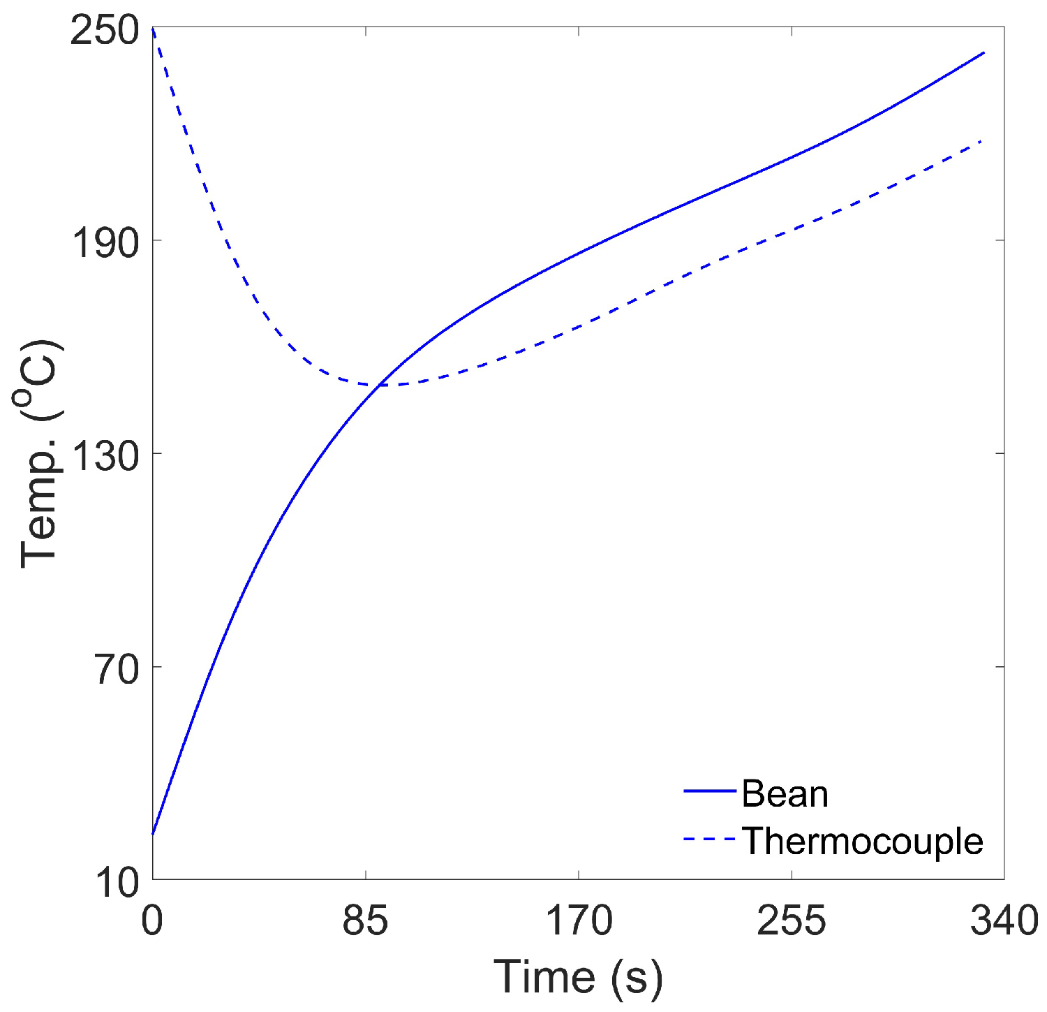 - A zero-dimensional, batch-scale simulation of coffee’s thermal evolution during roasting was formulated via energy balance.