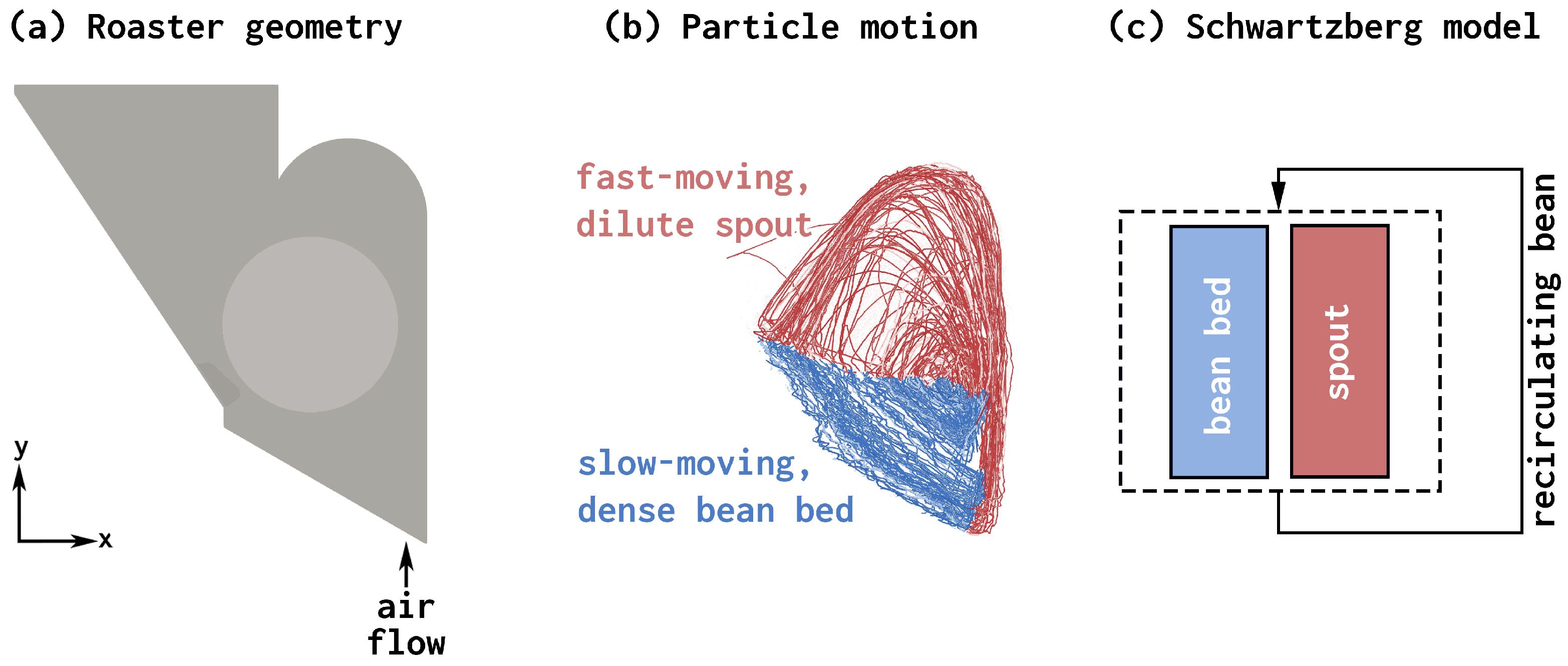 - Roasting conditions induce particle dynamics that create a thermally homogenous bean bed, so bean-to-bean conductive and radiative heat transfer are negligible.