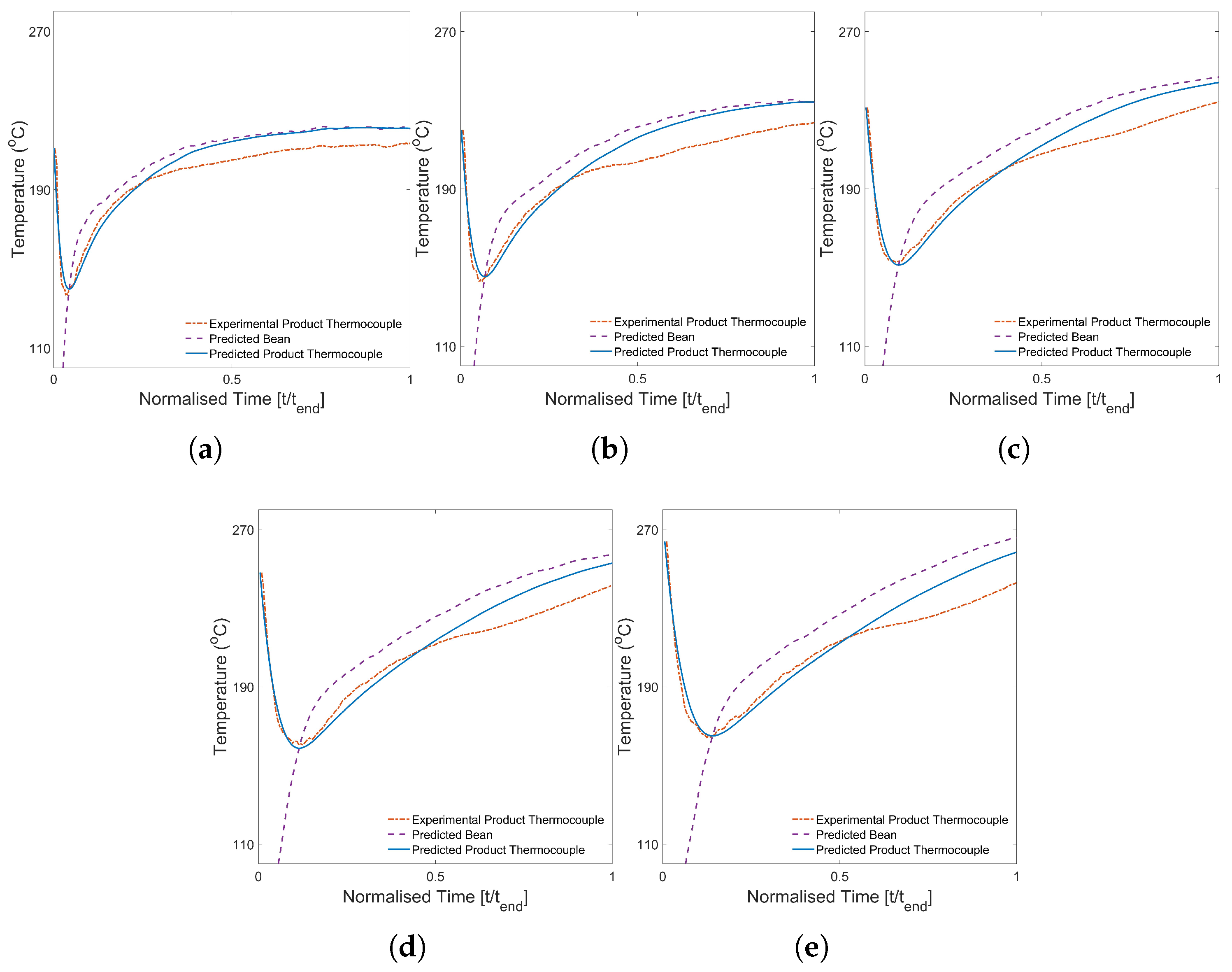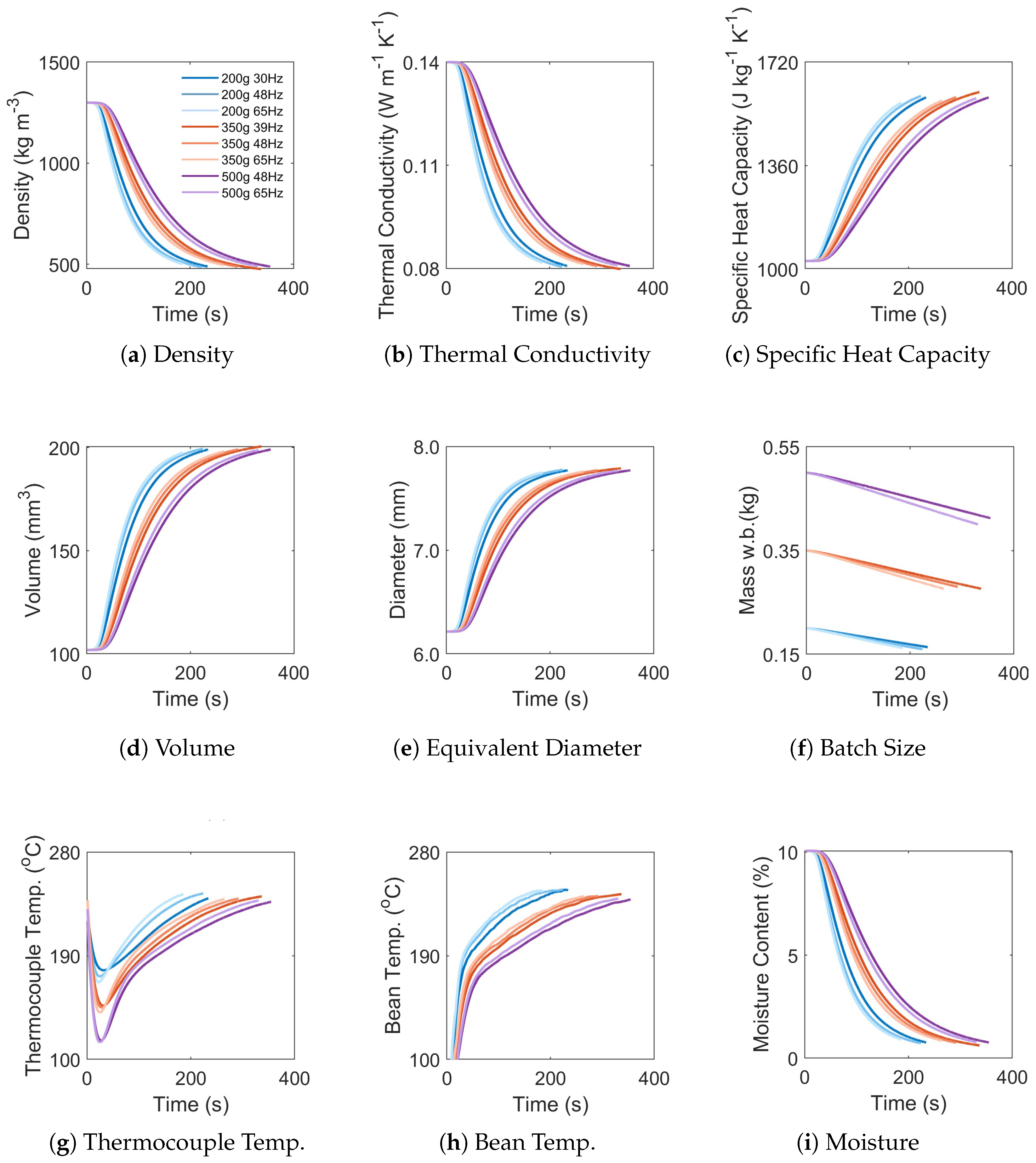 | Case Study | Batch Size (g) | Inlet Air Temp. (°C) | Fan Freq. (Hz) | Air Mass Flow Rate (kg s−1) | Roasting Times (s) |
