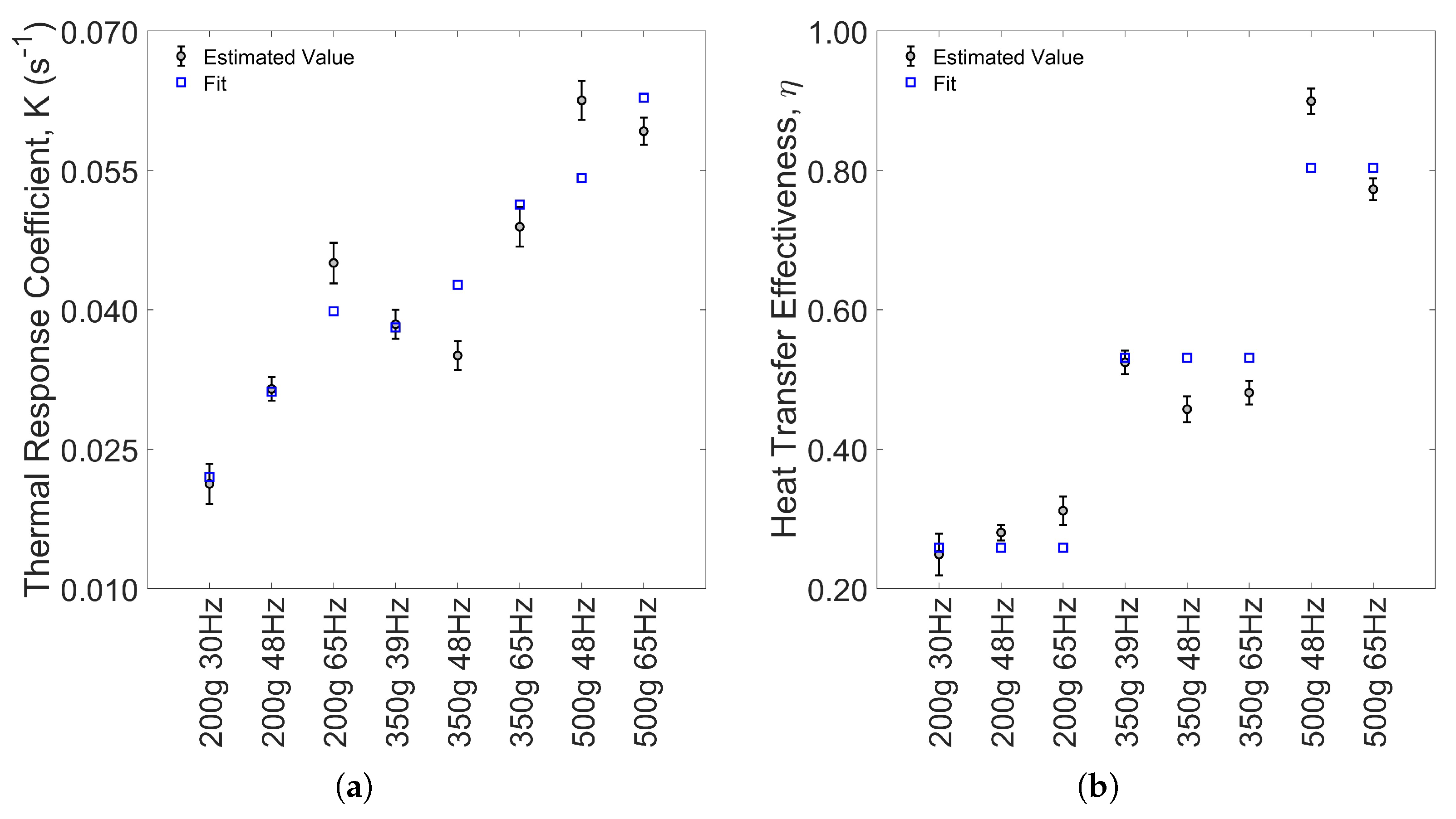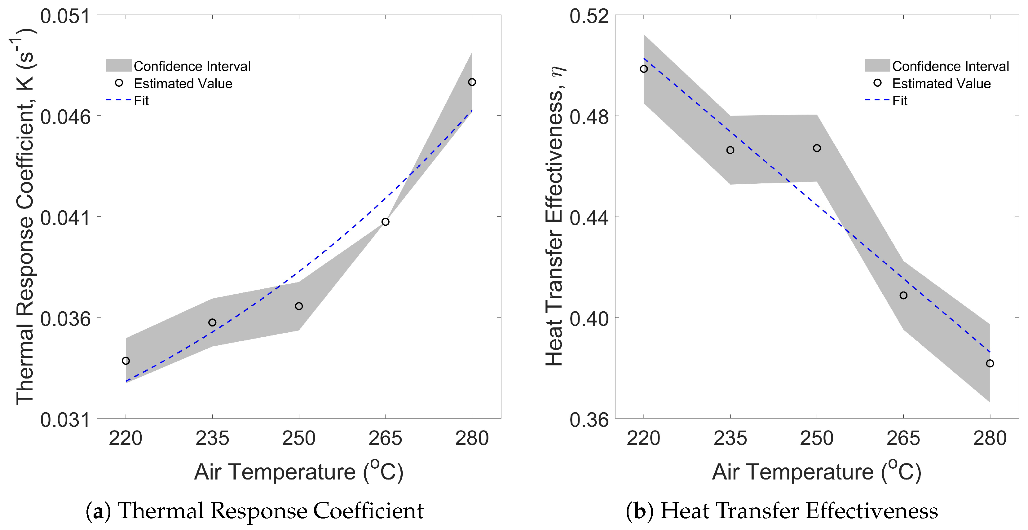 | Inlet Air Temp. (°C) | Batch Size (kg) | Fan Freq. (Hz) | Thermal Response Coefficient (s−1) | Effectiveness Factor | RMSE (°C) |