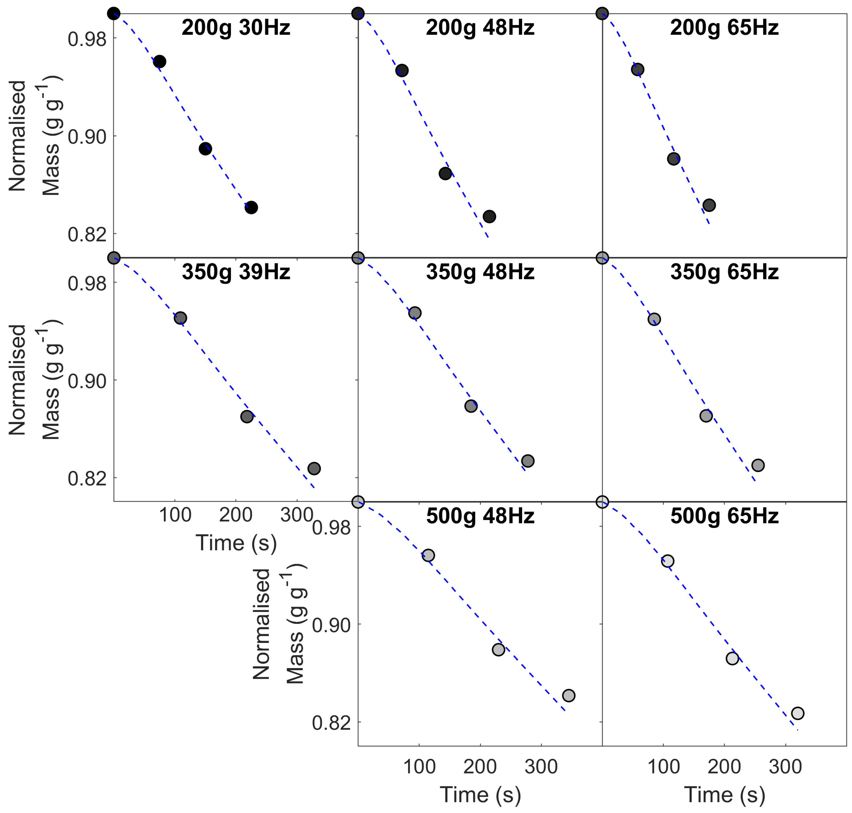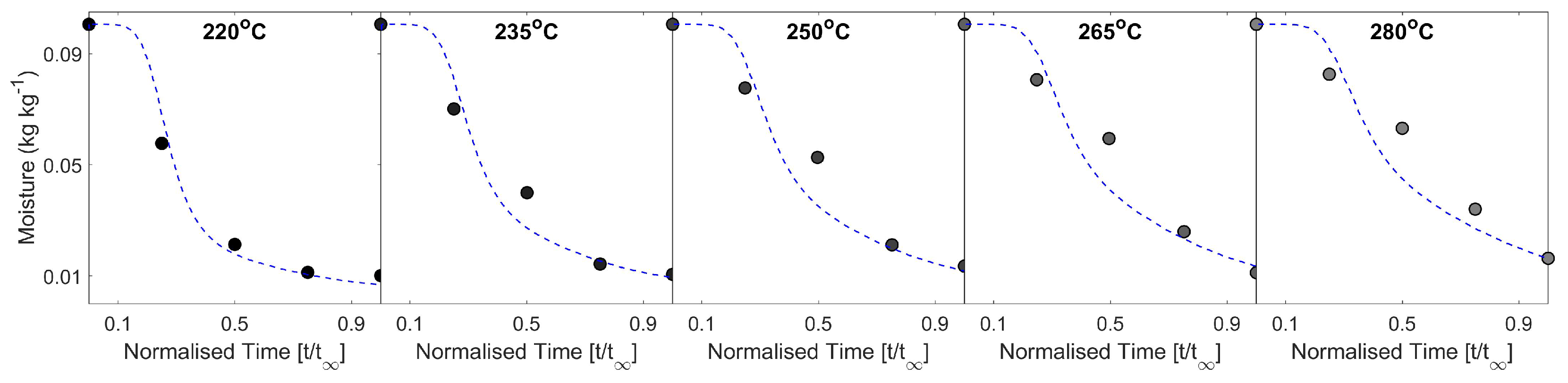 3.2. Calibration of Kinetic Models of Mass and Moisture Loss