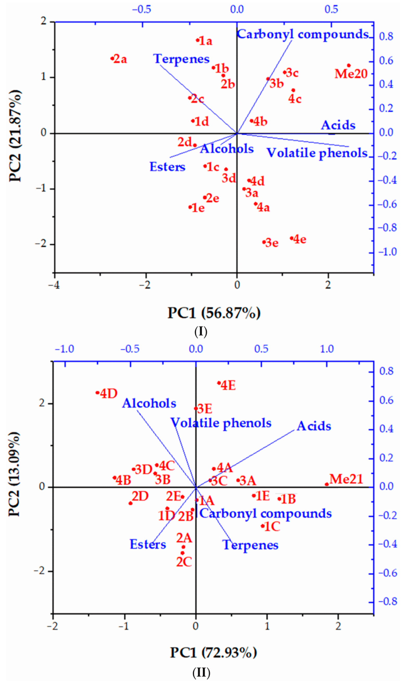 - Espitia-López, J.; Escalona-Buendía, H.B.; Luna, H.; Verde-Calvo, J.R. Multivariate Study of the Evolution of Phenolic Composition and Sensory Profile on Mouth of Mexican Red Merlot Wine Aged in Barrels vs Wood Chips. CyTA-J. Food 2015, 13, 26–31. [Google Scholar] [CrossRef]