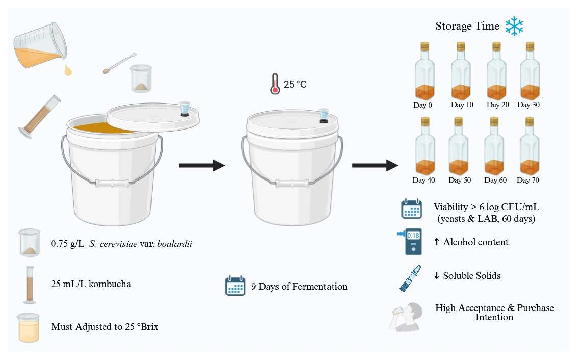 Teixeira RD, de Souza HF, Junior FVS, Teixeira FD, Pereira KN, de Oliveira ACD, da Cruz AG, Brandi IV, Ghantous GF, Kamimura ES. Shelf Life and Sensory Evaluation of a Potentially Probiotic Mead Produced by the Mixed Fermentation of Saccharomyces boulardii and Kombucha. Beverages. 2025; 11(6):166. https://doi.org/10.3390/beverages11060166