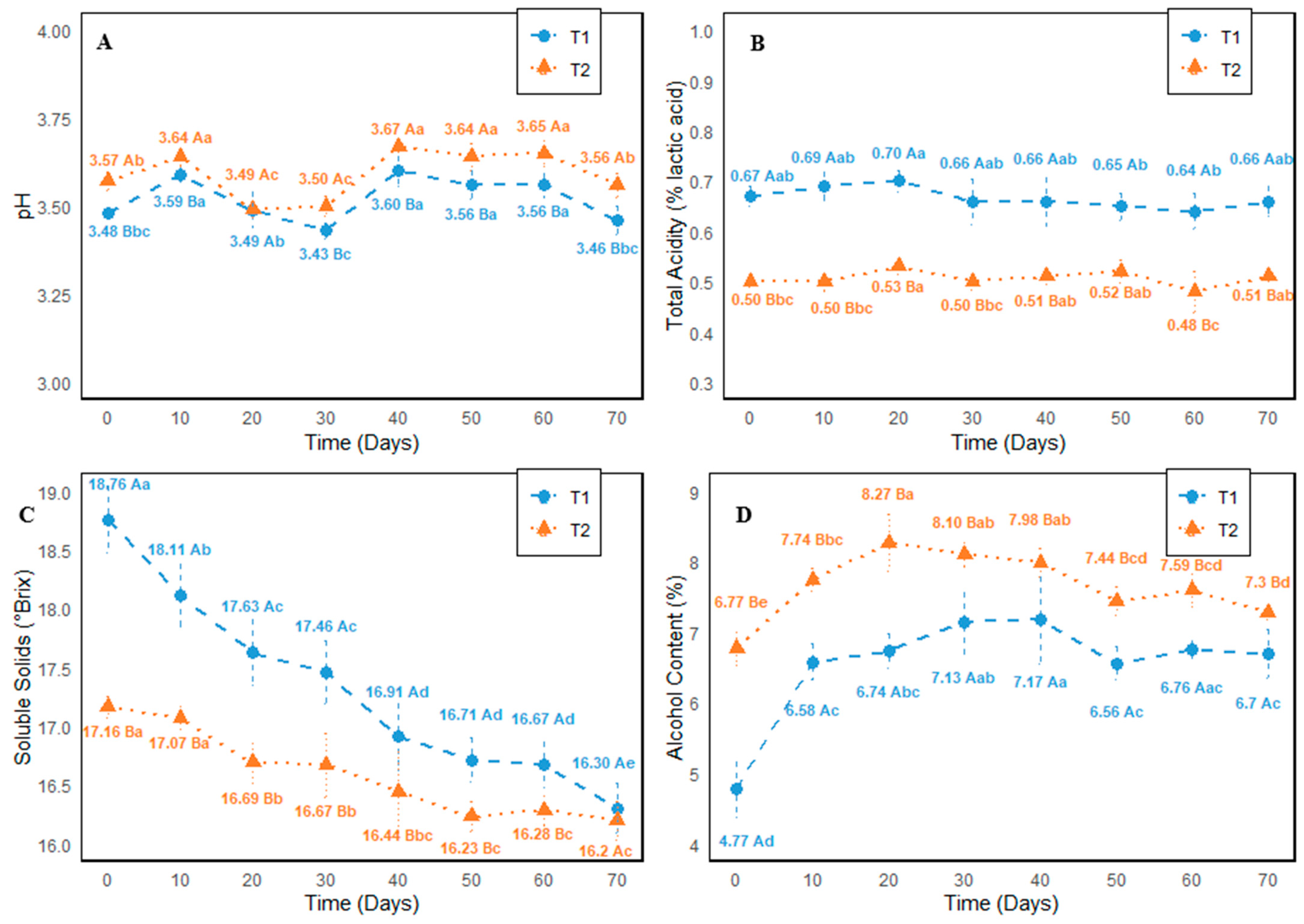 | Alcohol content | 7.56 ± 1.41 a | 6.56 ± 1.77 b | 6.64 ± 1.90 b |