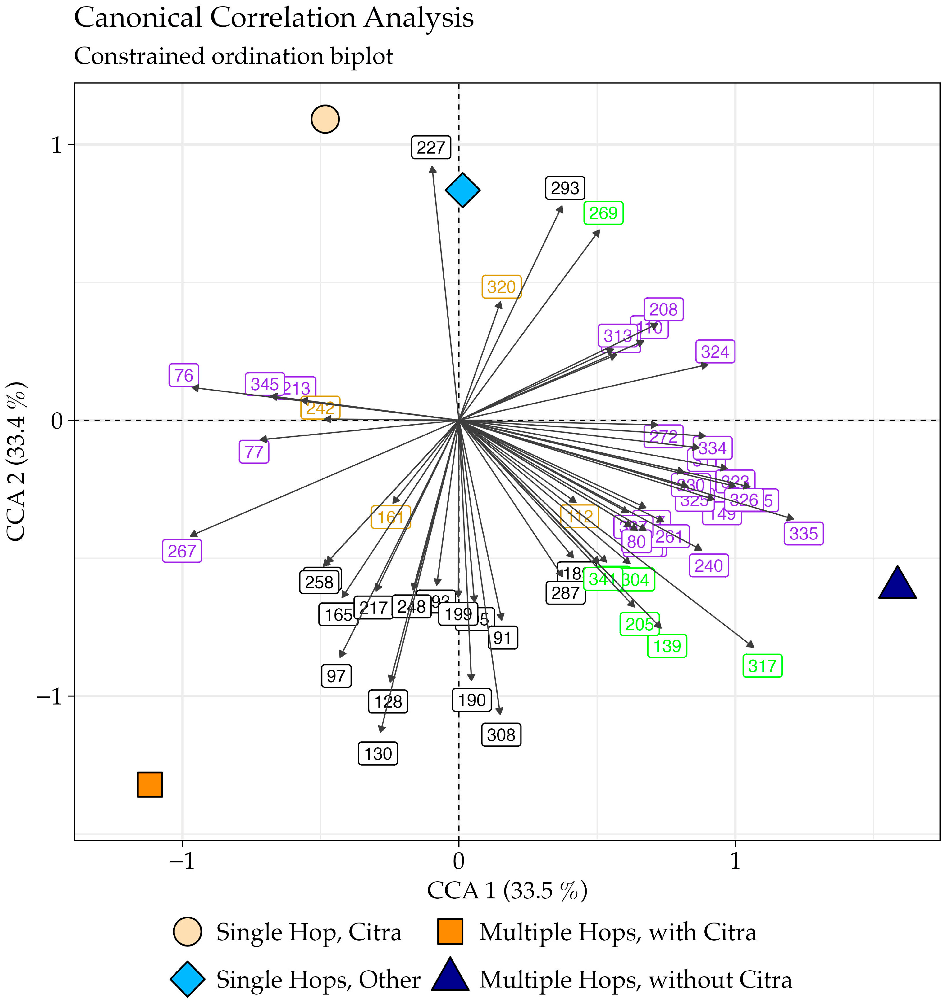 | Cpd Index | Compounds | Single Hop, Citra | Multiple Hops, with Citra | Single Hop, Other | Multiple Hops, Without Citra | CCA Corr | Exp. RI Idx | Lit. RI Idx | Ref | Aroma Description |