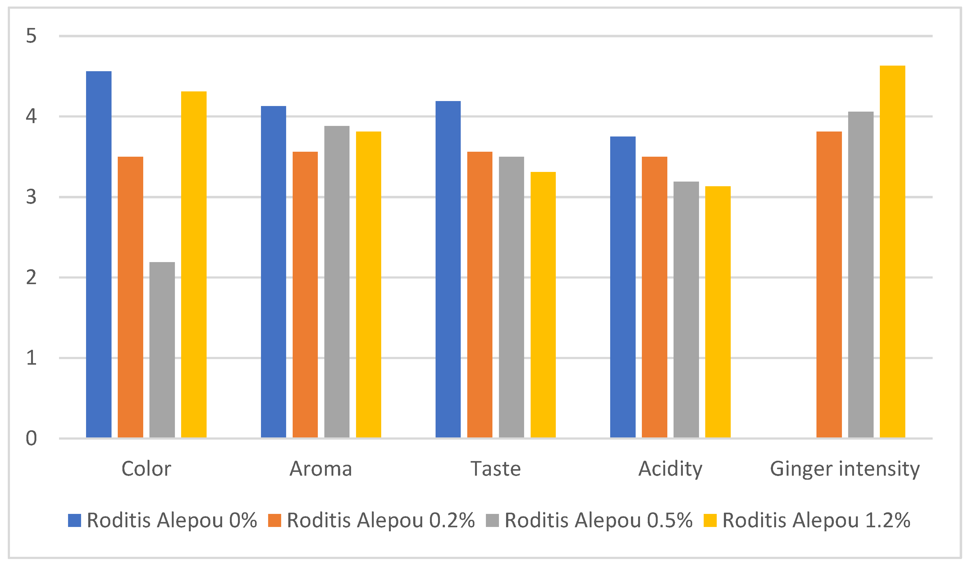 - A spicy taste was noted as intense in the samples that were enriched with ginger powder at concentrations of 0.5% and 1.2% (w/v), though no significant olfactory intensity was observed in these concentrations.