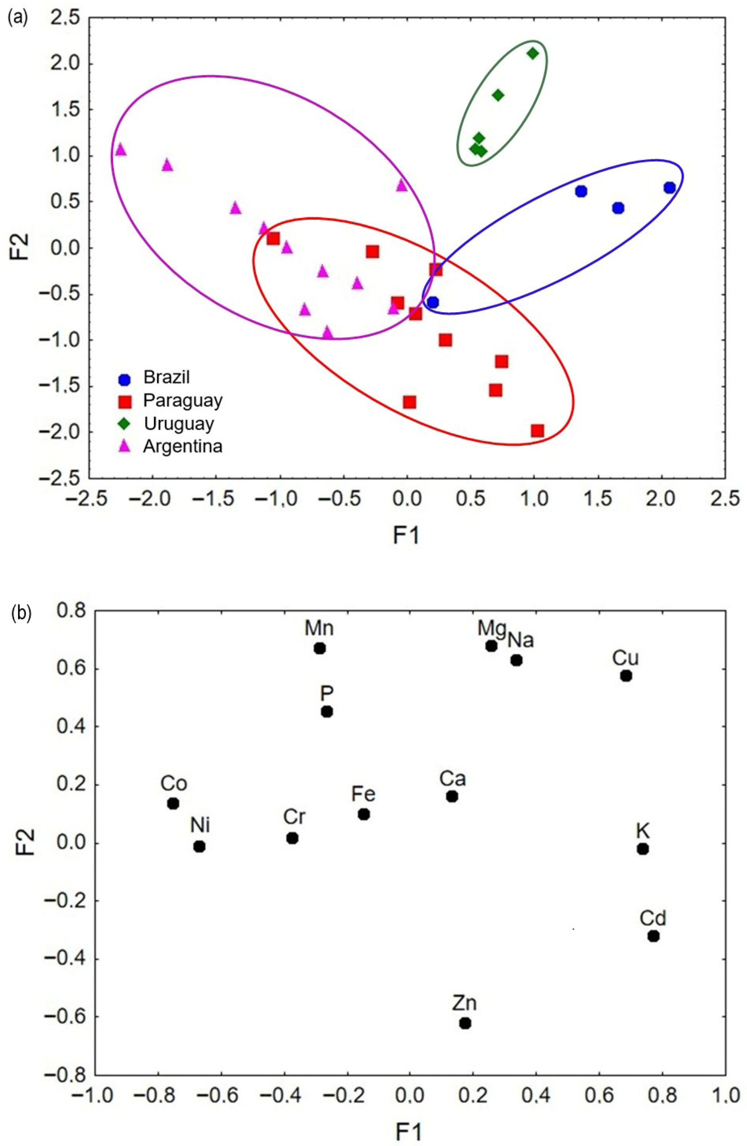 | Uruguay | P a | Mg a, Cu a, Mn a | - | Mg a Cu a,b, Na a |