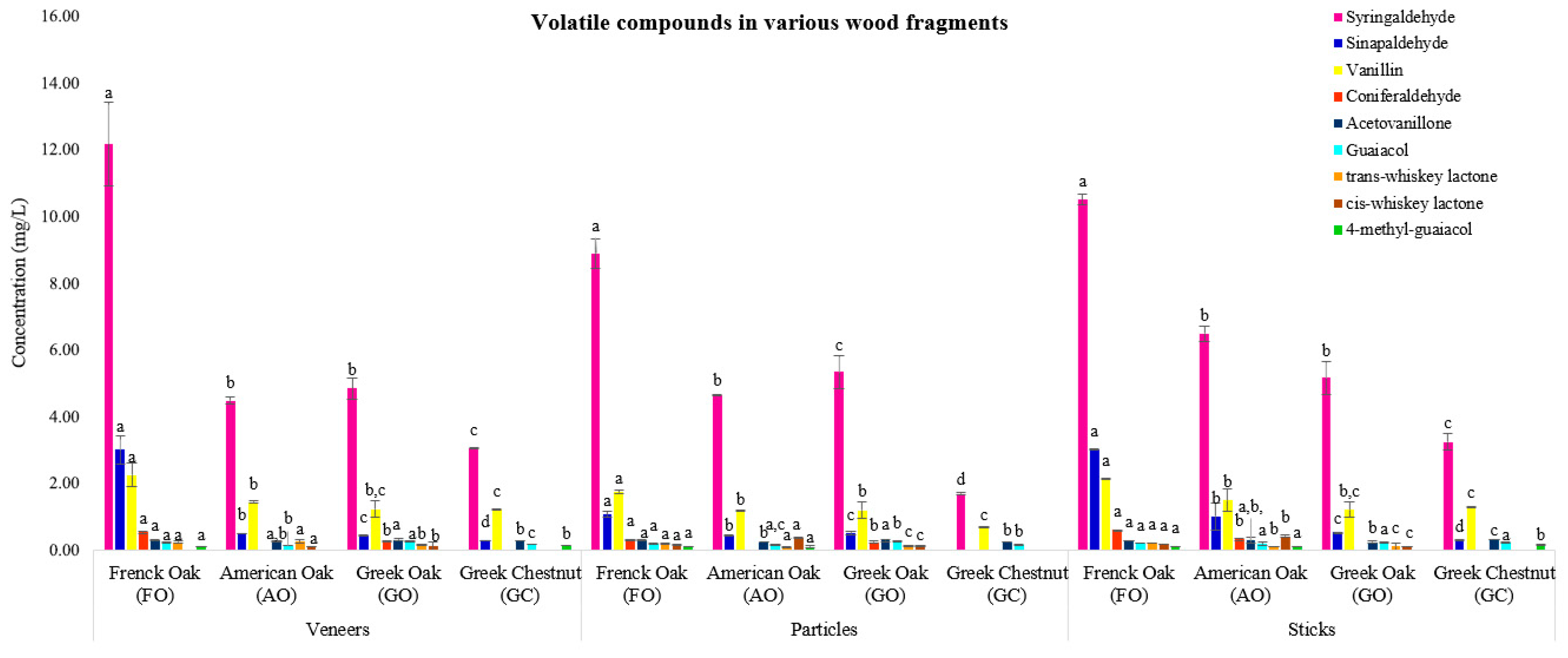 Figure 3. Volatile compounds in aged tsipouro after contact with different wood fragment types (veneers, particles, sticks) from four wood origins (French oak (FO), American oak (AO), Greek oak (GO), Greek chestnut (GC)). Values represent mean ± SD (n = 3). Different Latin letters indicate statistically significant differences (p < 0.05) for the same compound among wood origins within the same fragment type.