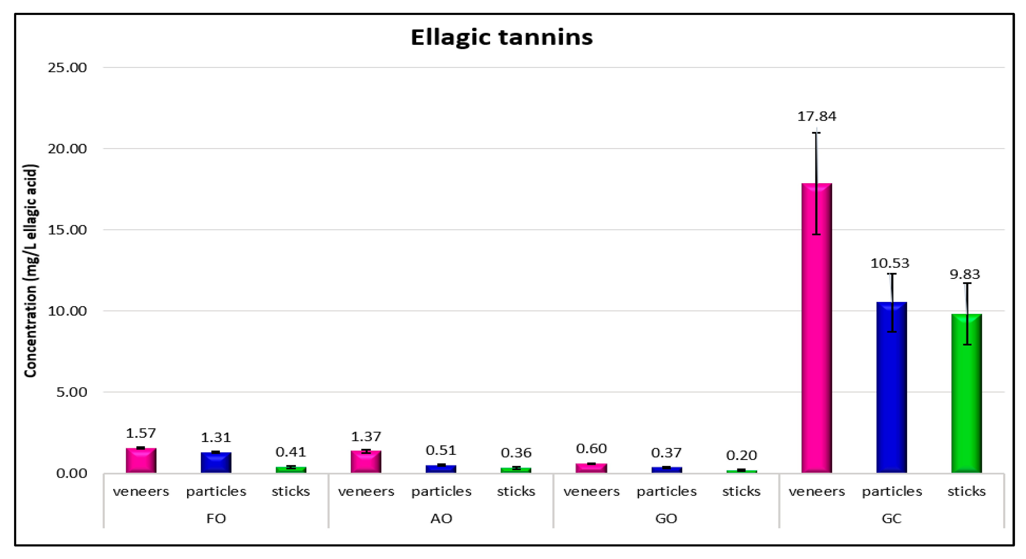 Figure 4. The total ellagic tannins’ concentration, expressed as mg/L of ellagic acid in aged tsipouro after contact with different wood fragment types (veneers, particles, sticks) from four wood origins (French oak (FO), American oak (AO), Greek oak (GO), and Greek chestnut (GC)). Values represent mean ± SD (n = 3).