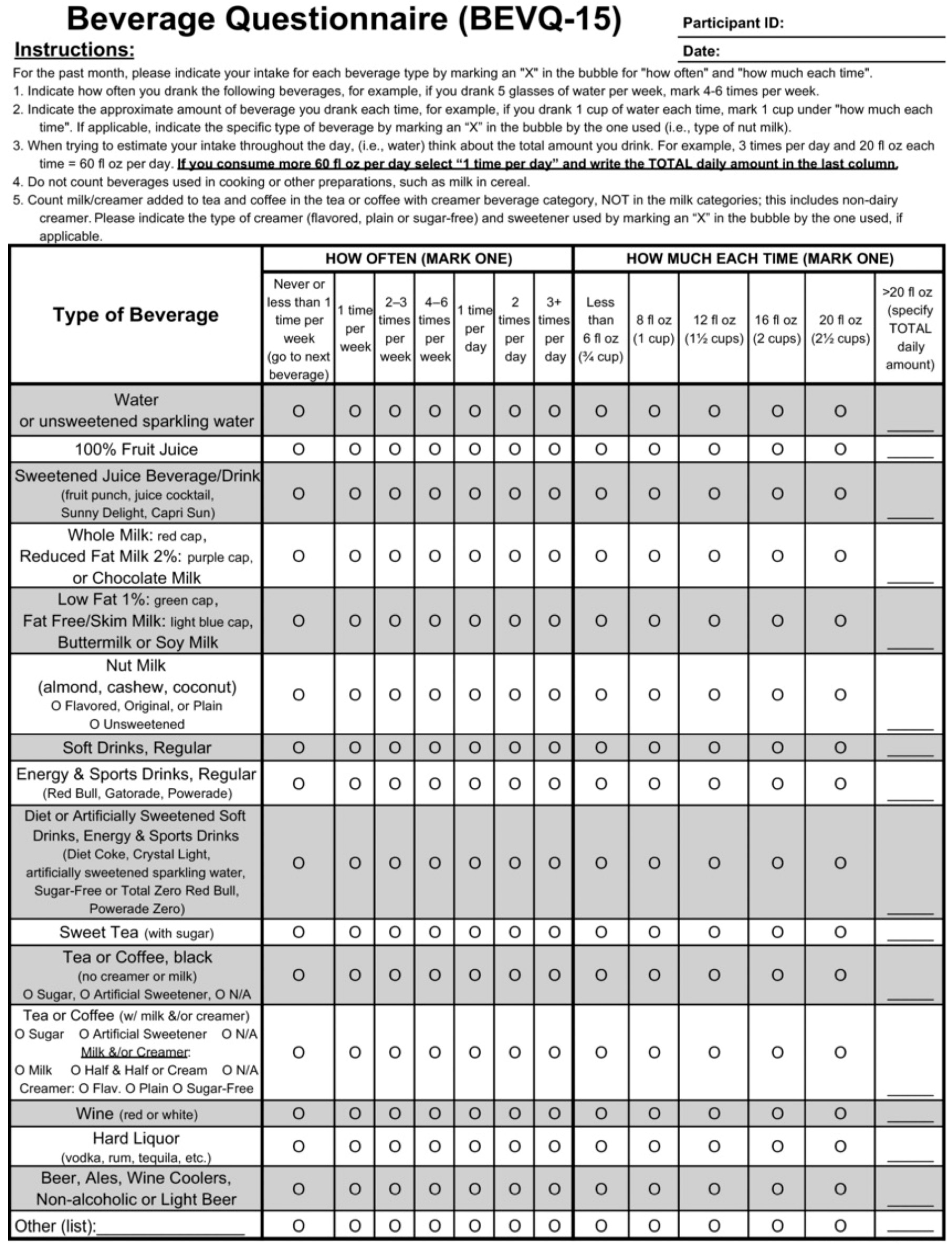 - Hedrick, V.E. Development and Evaluation of a Brief Questionnaire to Assess Habitual Beverage Intake (BEVQ-15): Sugar-Sweetened Beverages and Total Beverage Energy Intake; Virginia Tech: Blacksburg, VA, USA, 2011. [Google Scholar]