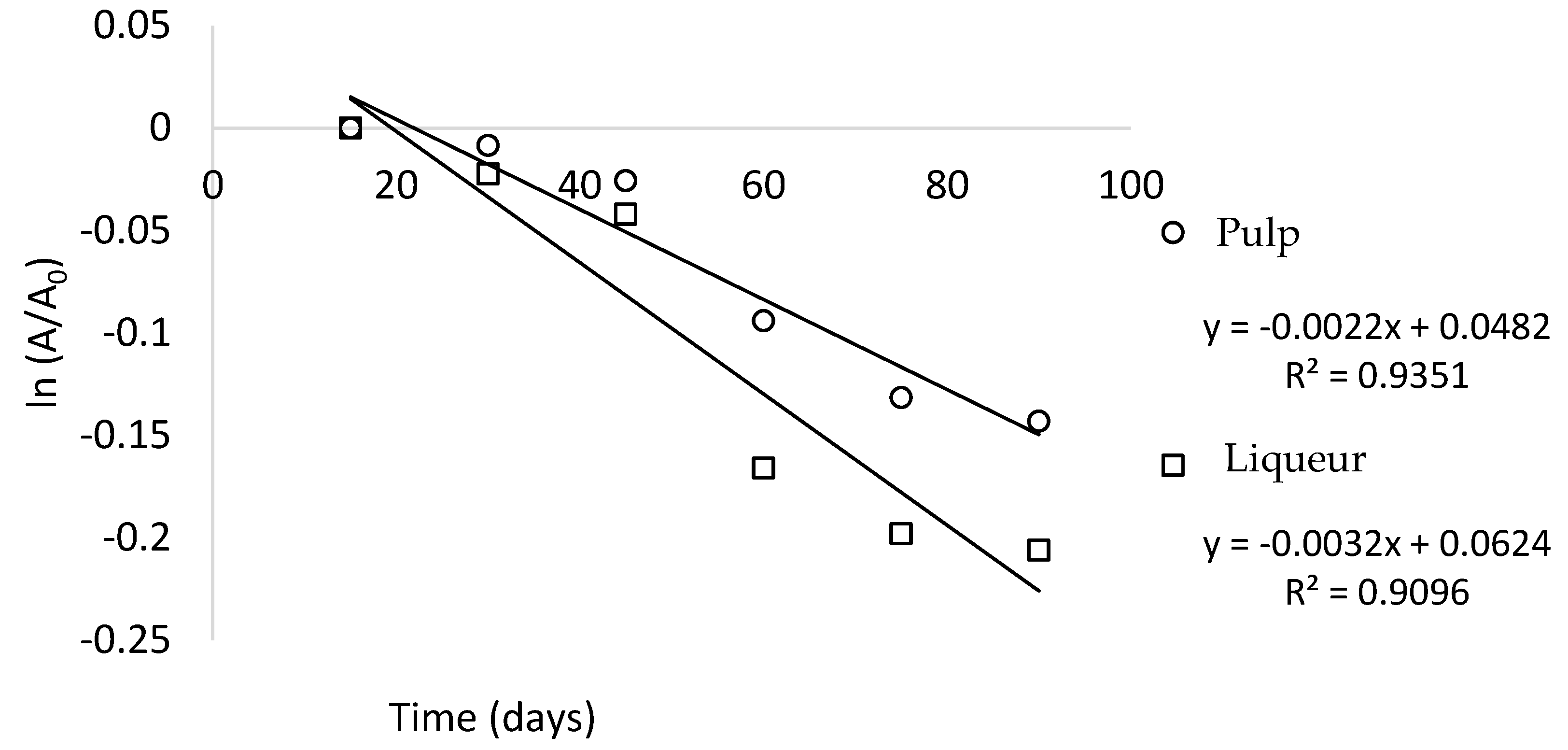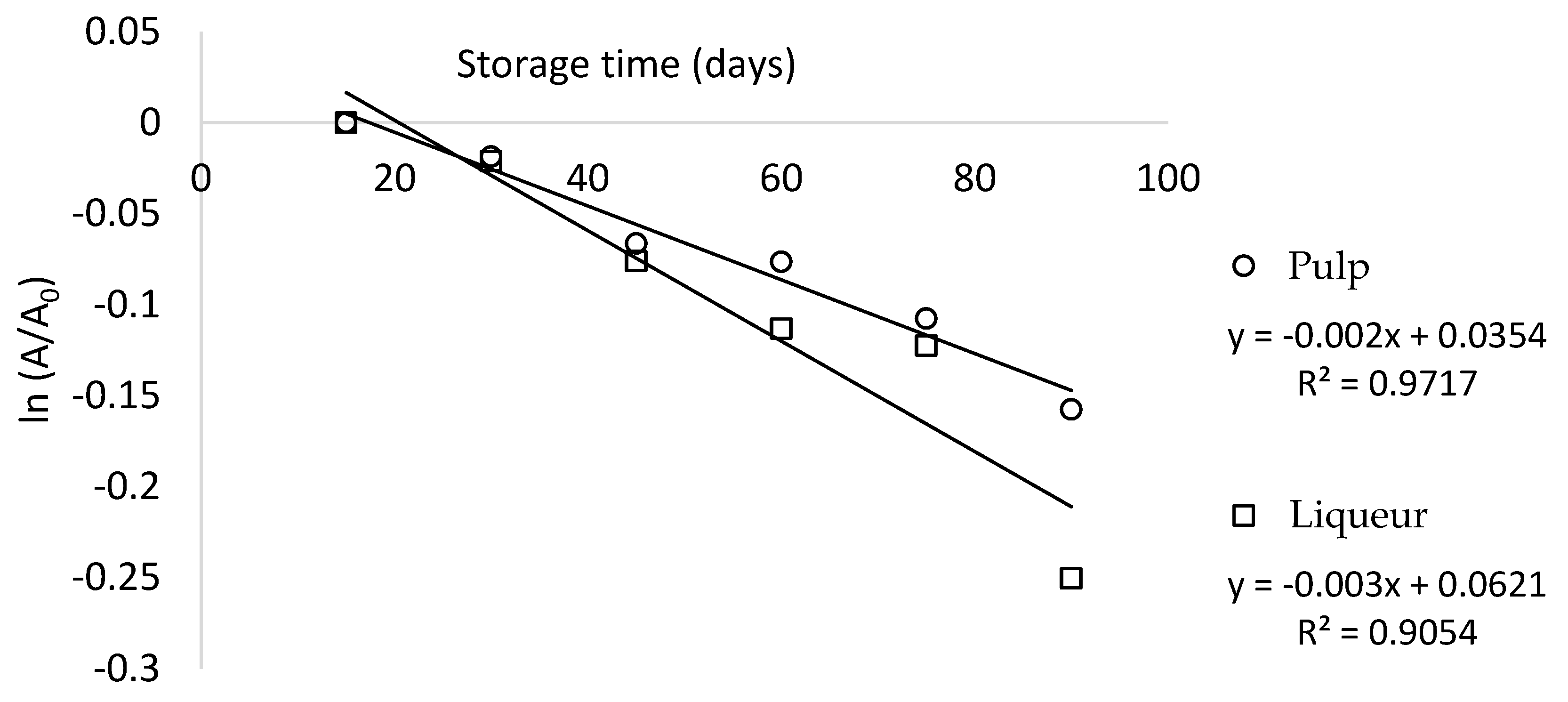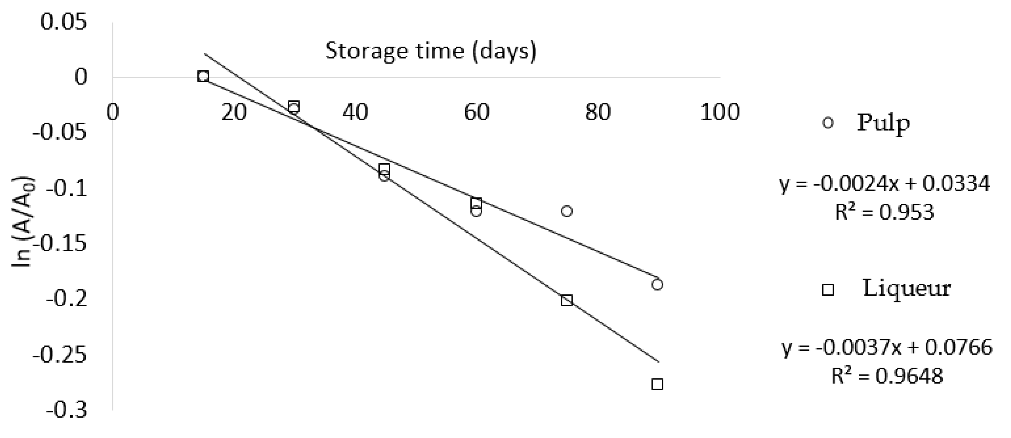 - Ascorbic acid and antioxidant capacity in liquor decayed at a higher rate than in pulp.