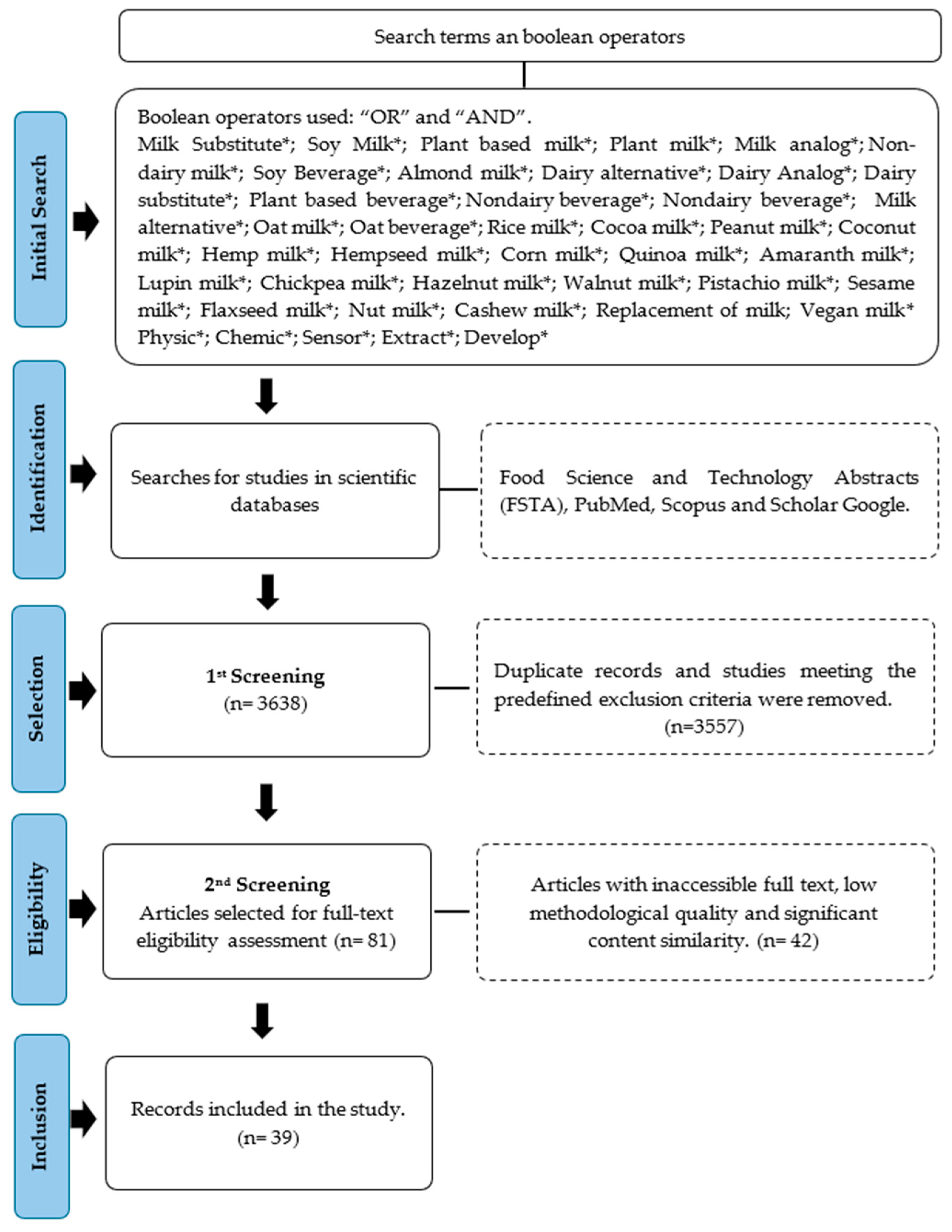 | Sakthi et al. [29] India | Peanut cultivars, water, and sugar. | Peanut milk samples were prepared by five different processing methods: T1: Fresh; T2: Blanching; T3: Soaking; T4: Roasting; T5: Germination. | T4 had the highest viscosity value (4.98–4.92) and T2 the highest L* (85.24) levels. | T4 had the highest antioxidant activity: 64% radical-scavenging activity (RSA). Total soluble solids (TSSs): 11–12. |