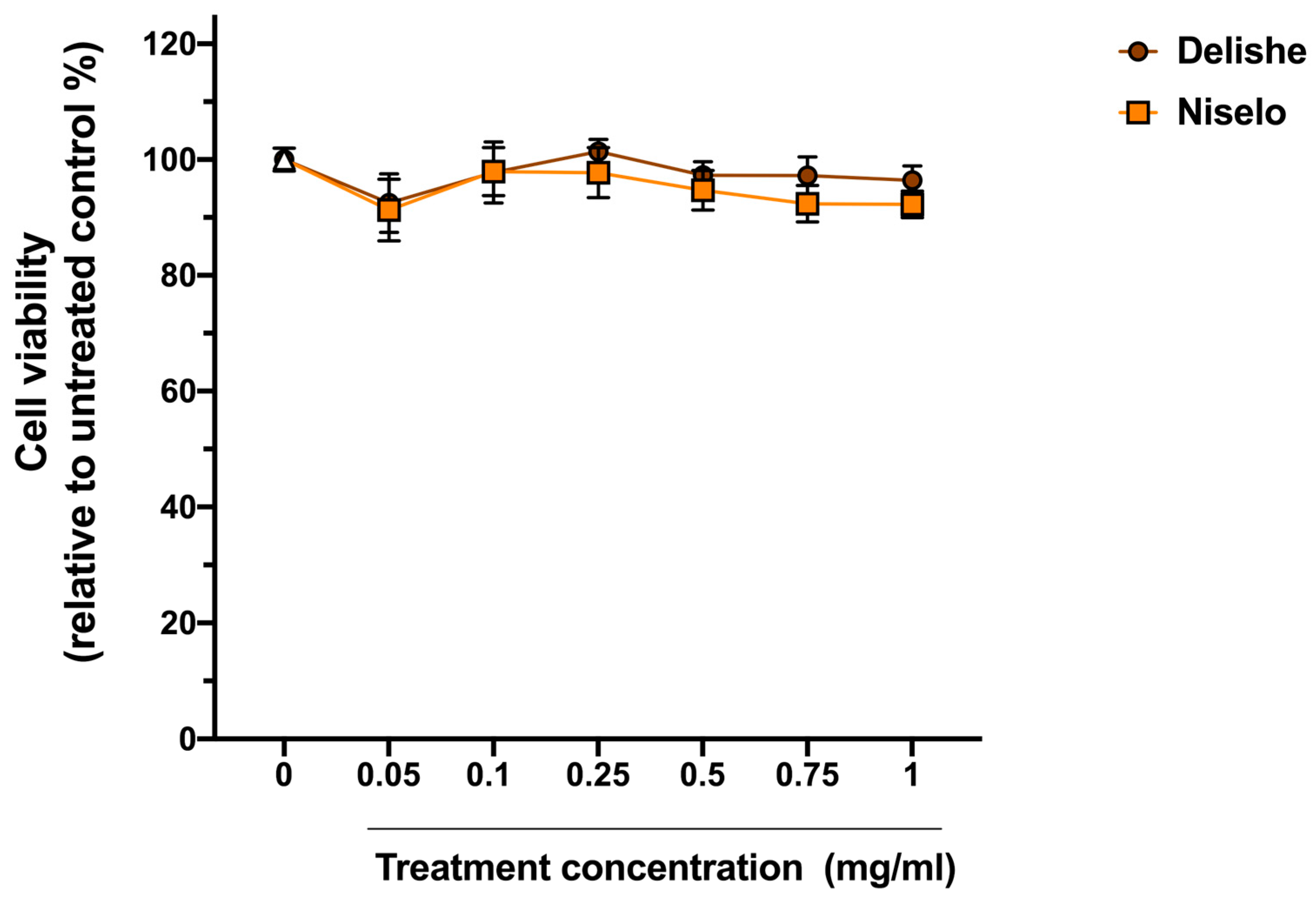 3.2. Effects of Niselo and Delishe Fermented Beverages on Cell Viability