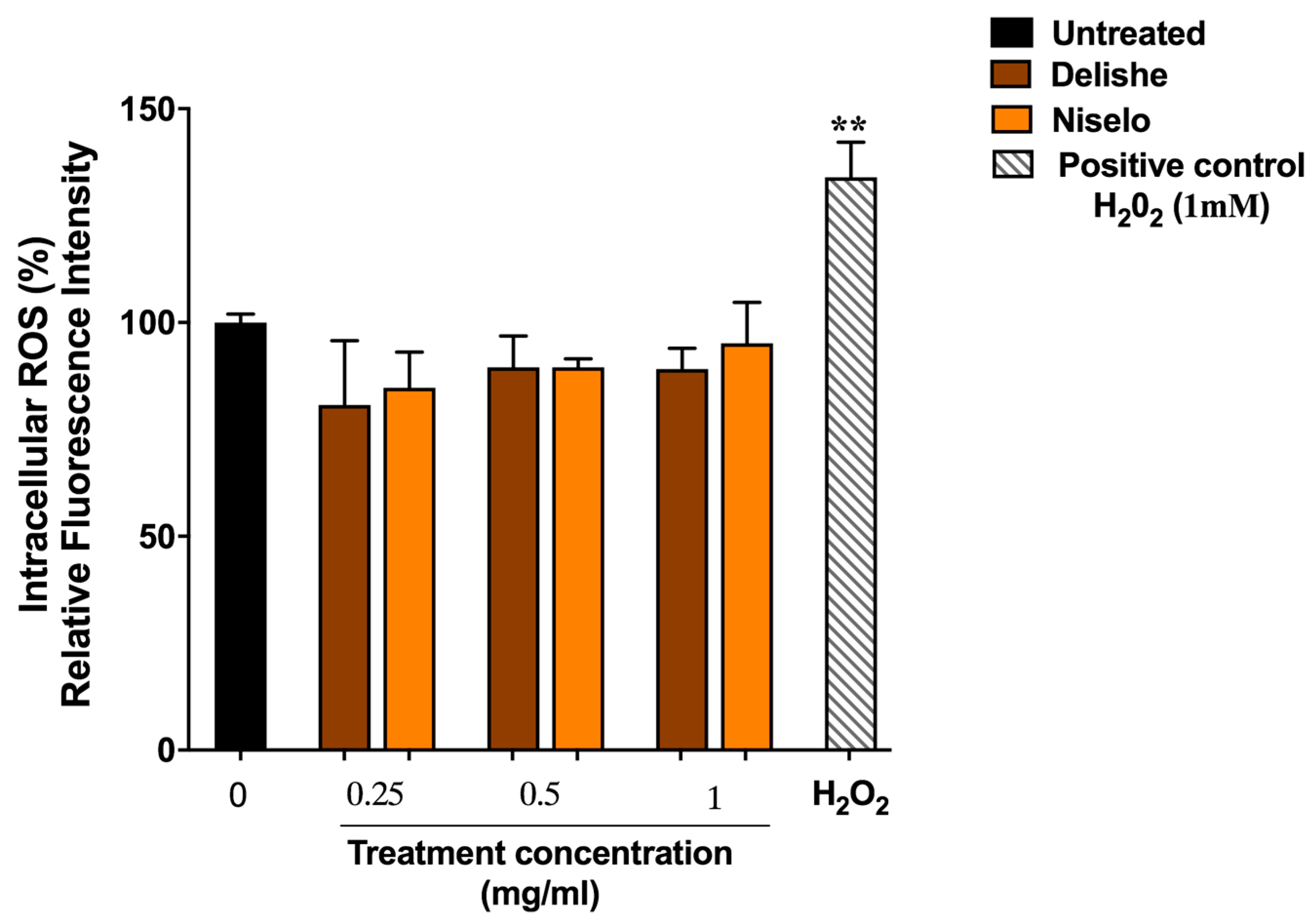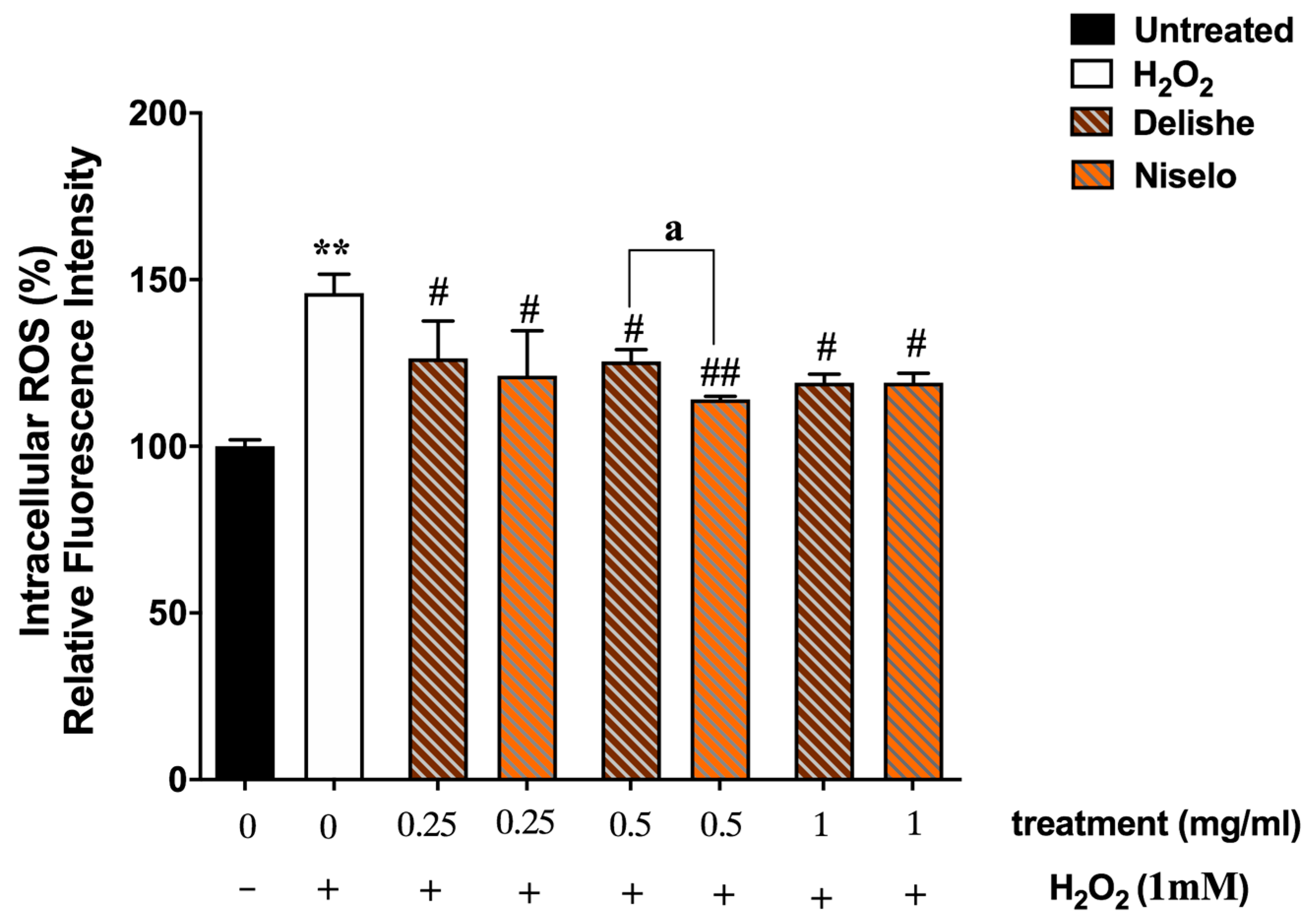 3.3. Intracellular ROS Levels in Caco-2 Cells Treated with Delishe and Niselo Beverages