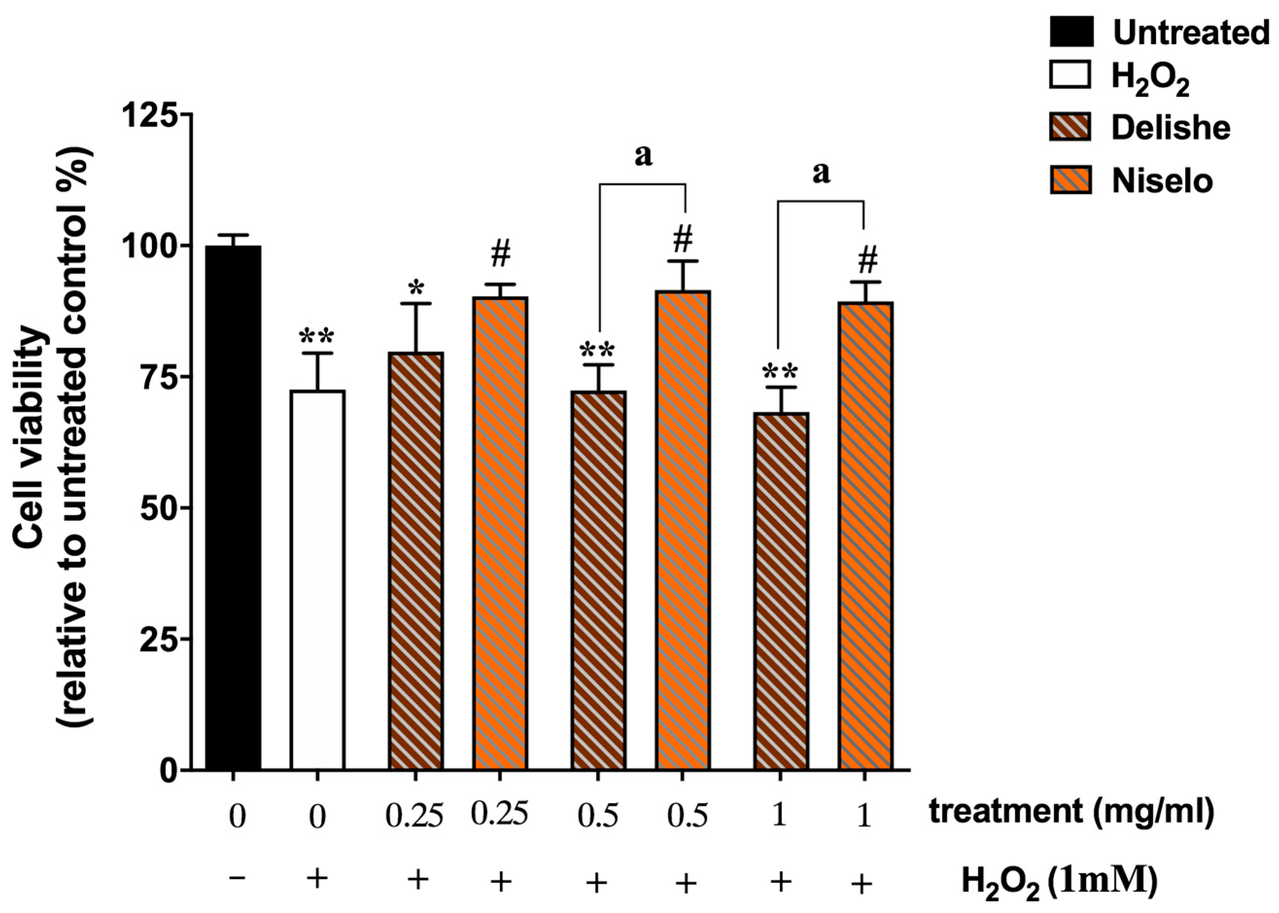 2.7. H2O2-Induced Cytotoxicity Assays