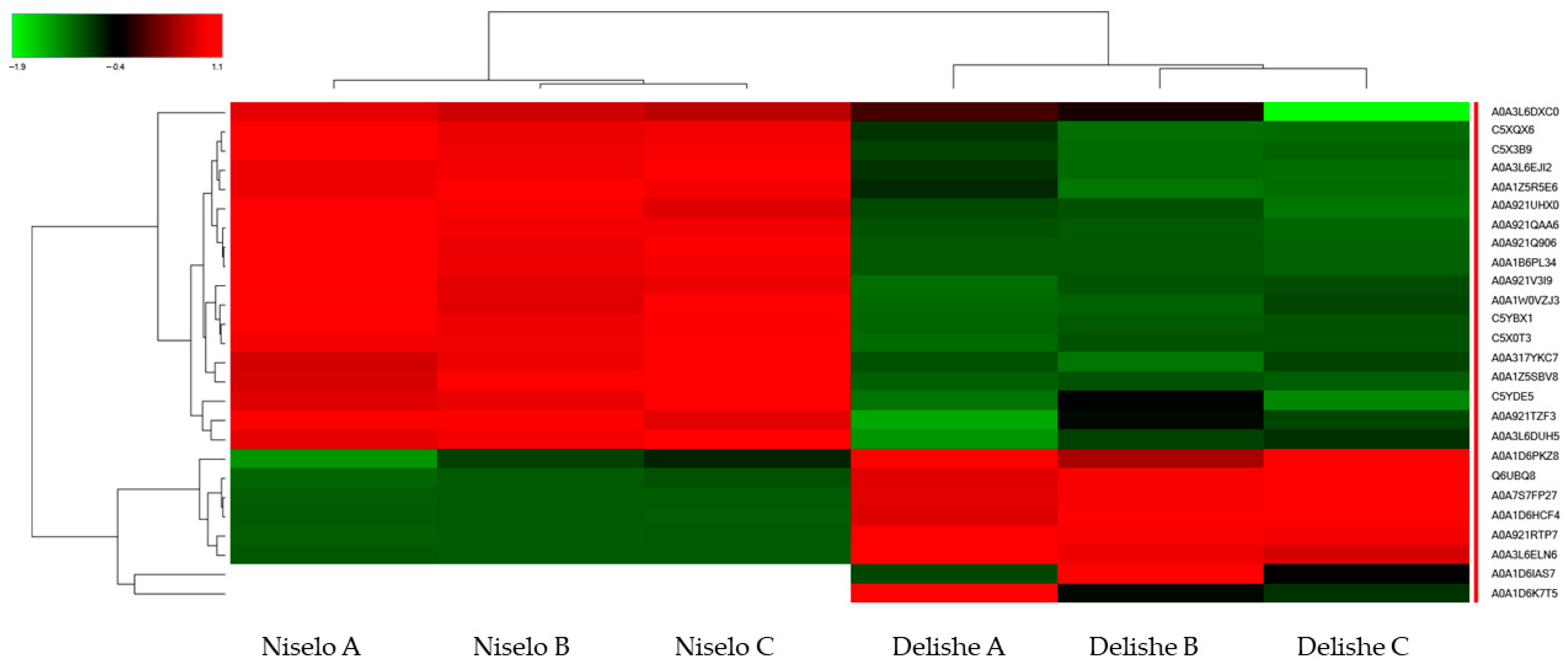 | Protein | Peptide | Average Scaled Abundance (%) | Abundance Ratio (Niselo/Delishe) | |||||||
