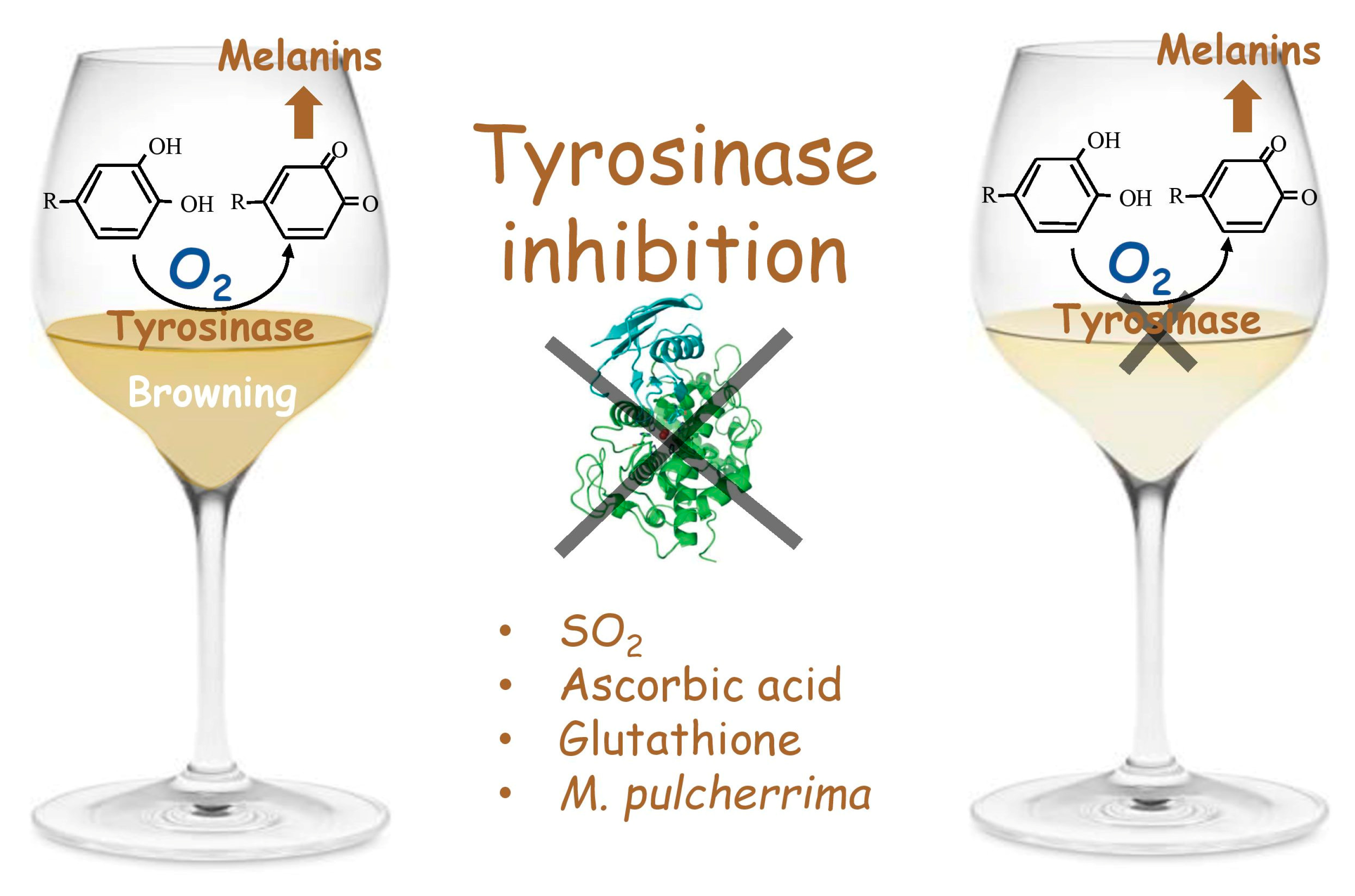 This study investigates the effect of ascorbic acid, glutathione (both in its pure form and as inactivated dry yeast), and a selected strain of M. pulcherrima on preventing tyrosinase-catalyzed oxidation, employing the methodology previously reported by our research group [36]. We hypothesize that these treatments can reduce tyrosinase activity and limit enzymatic browning.