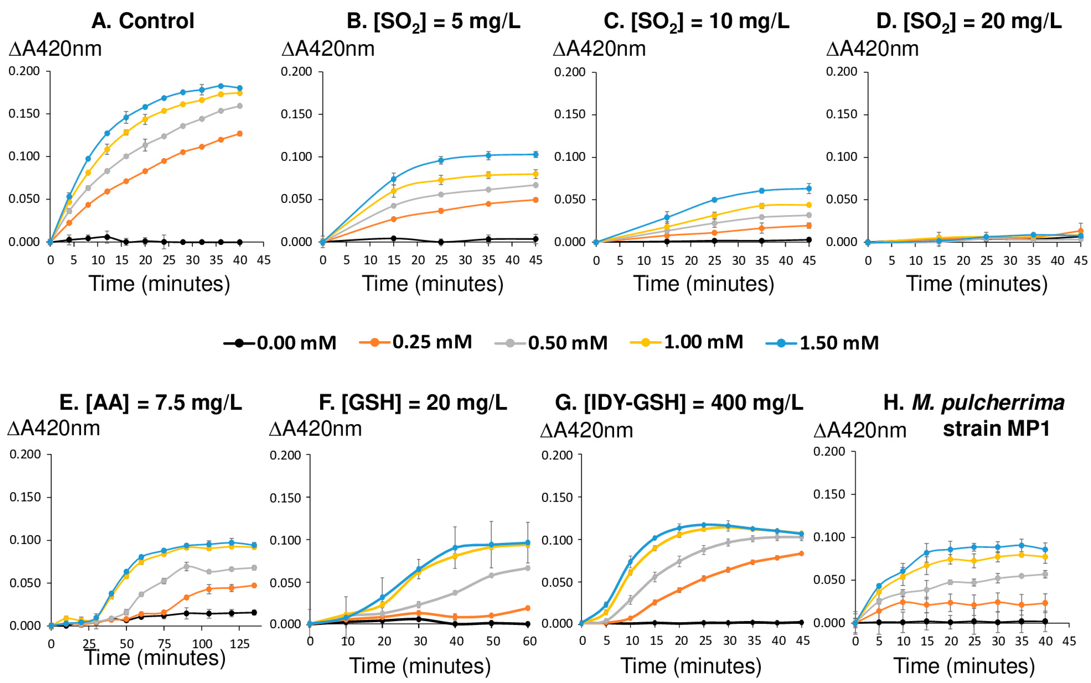 The apparent tyrosinase activity was determined by the methodology previously developed by our group [37]. We refer to tyrosinase activity as “apparent” because it was assessed solely by measuring the browning reaction kinetics. This browning results not only from the enzymatic oxidation caused by tyrosinase but also from subsequent polymerization reactions of quinones, which produce the melanins responsible for the observed browning. Briefly, aliquots of 1.8 mL of the grape must, from which all phenolic compounds had been removed, were introduced into spectrophotometer microcuvettes with a 10 mm optical path length, and sulphur dioxide, ascorbic acid, glutathione, IDY-GSH extract, or M. pulcherrima inoculum were added. The effect of sulphur dioxide was tested at 0, 5, 10, and 20 mg/L, ascorbic acid at 7.5 mg/L, glutathione at 20 mg/L, IDY-GSH extract equivalent to 400 mg/L of the commercial product, and M. pulcherrima strain MP1 at 250 mg/L. The concentrations of SO2, glutathione, and IDY-GSH correspond to those commonly employed in winemaking practices. In the case of ascorbic acid, a lower-than-usual dose (7.5 mg/L) was applied, as higher concentrations did not result in any increase in absorbance at 430 nm. Afterwards, caftaric acid was added at concentrations of 0, 0.25, 0.50, 1.0, and 1.5 mM. These concentrations were selected according to a previous work [17]. The total volume was adjusted to 2 mL using distilled water. The microcuvettes were manually shaken to homogenize and saturate the must with oxygen, and periodic measurements of absorbance at 420 nm were made to monitor the formation of brown pigments until asymptomatic behavior was observed. Experiments were carried out in triplicate at 25 °C. The apparent tyrosinase activity was determined by measuring the increase in absorbance at 420 nm over time, using the linear portion of the obtained curves, and it was expressed in mUA420/minute.