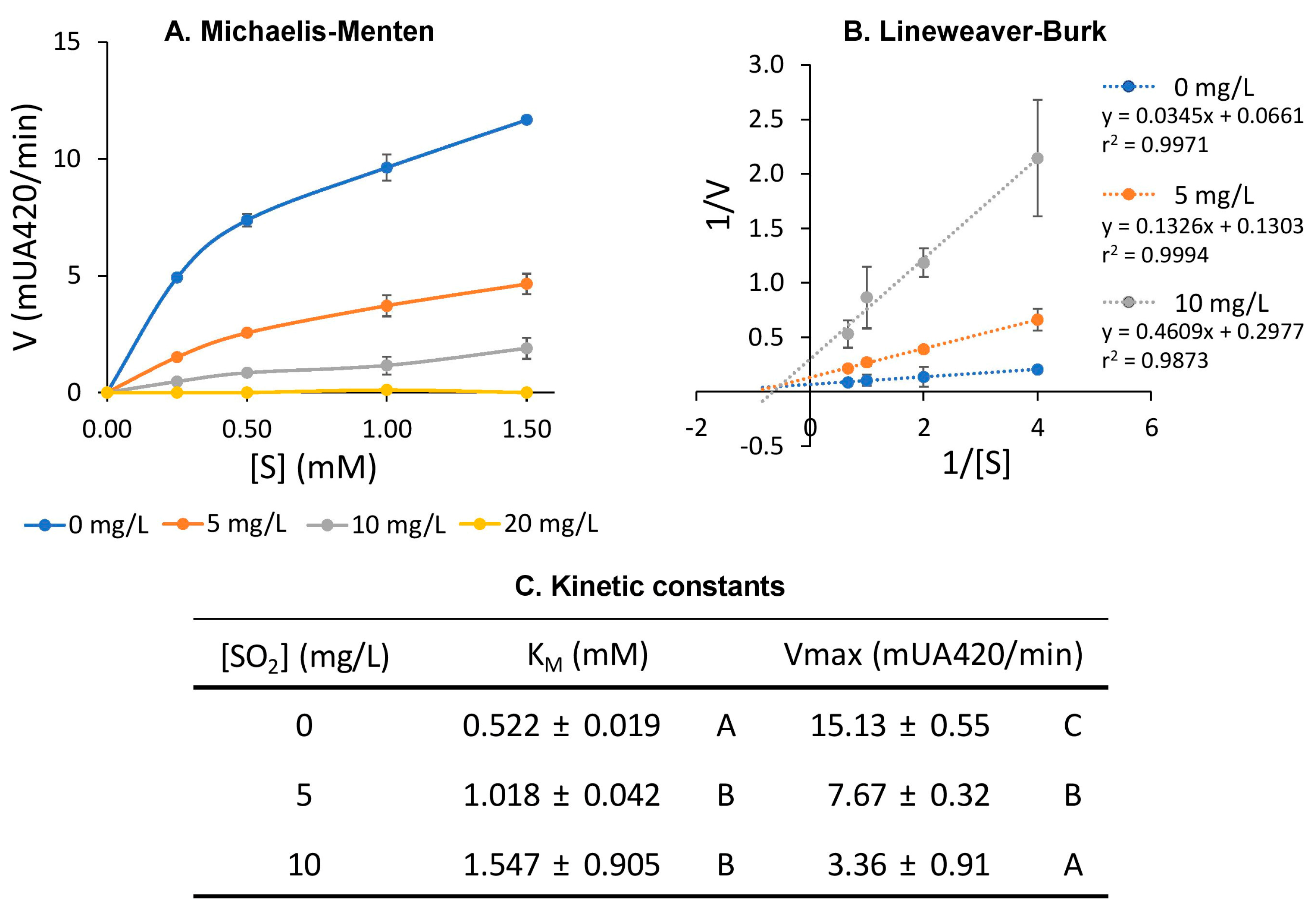 Figure 2 also shows the influence of sulphur dioxide on the browning kinetics induced by tyrosinase by means of Michaelis–Menten and Lineweaver–Burk plots. The results shown in the Michaelis–Menten plot (Figure 2A) clearly confirm that sulphur dioxide is a potent inhibitor of apparent tyrosinase activity, as increasing concentrations of sulphur dioxide correspond to a progressive decrease in the reaction rate.