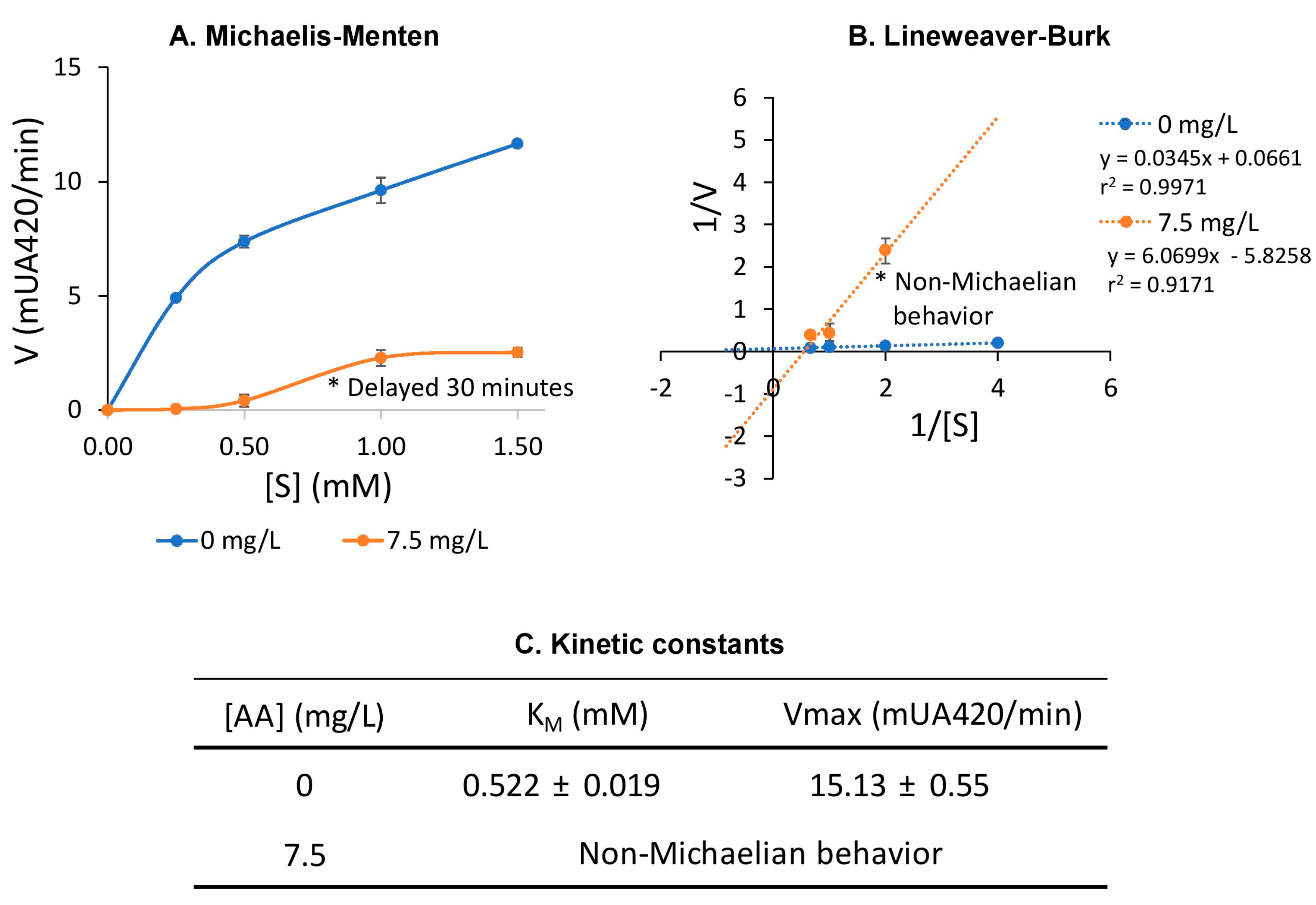 Figure 3 illustrates the effect of ascorbic acid on the tyrosinase-induced browning kinetics, analyzed through Michaelis–Menten and Lineweaver–Burk plots, in comparison to control conditions without any inhibitor supplementation.