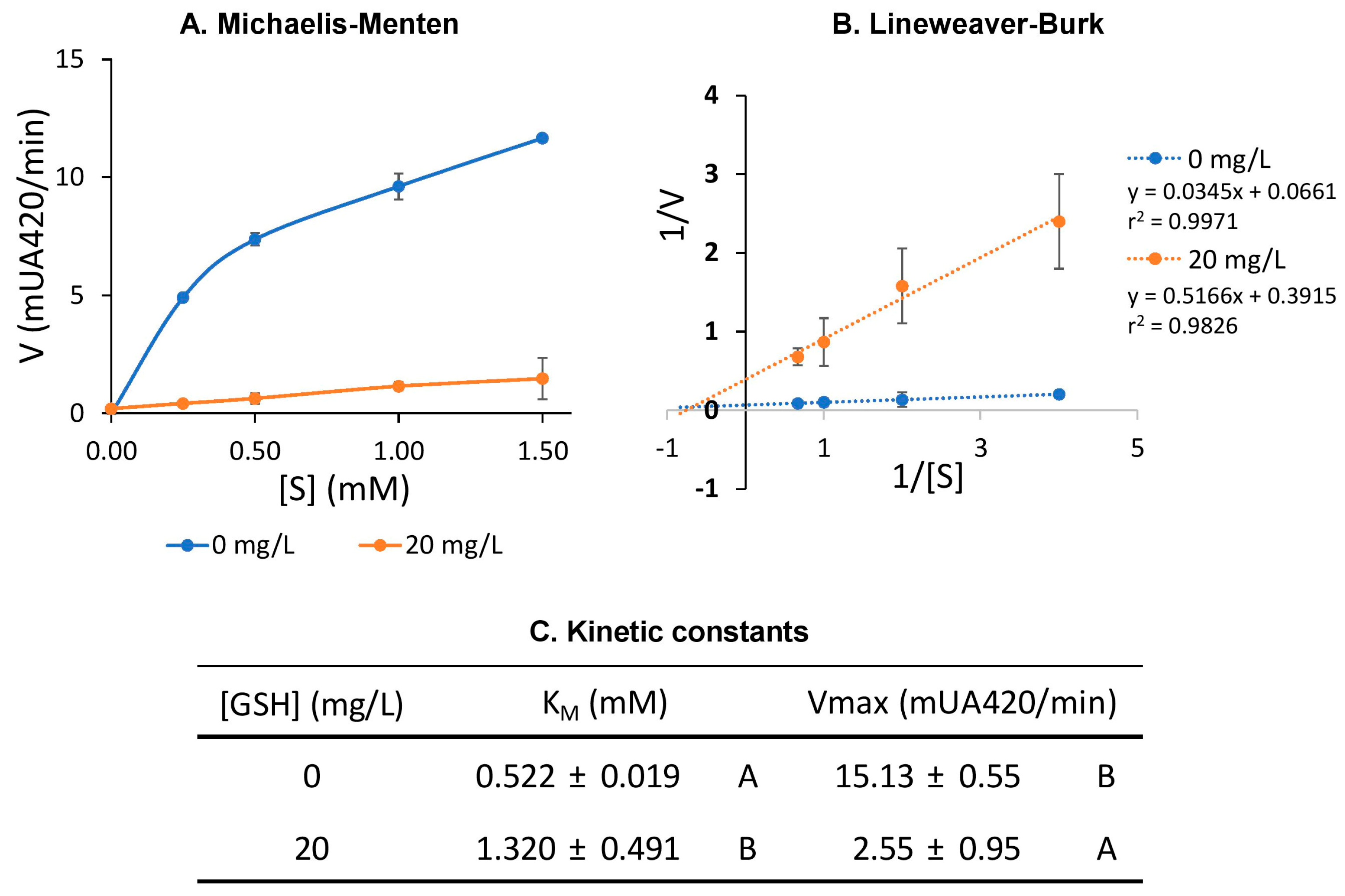Figure 4 shows the effect of glutathione on the tyrosinase-induced browning kinetics, analyzed using Michaelis–Menten (Figure 4A) and Lineweaver–Burk (Figure 4B) plots, in comparison to control conditions without any inhibitor supplementation.