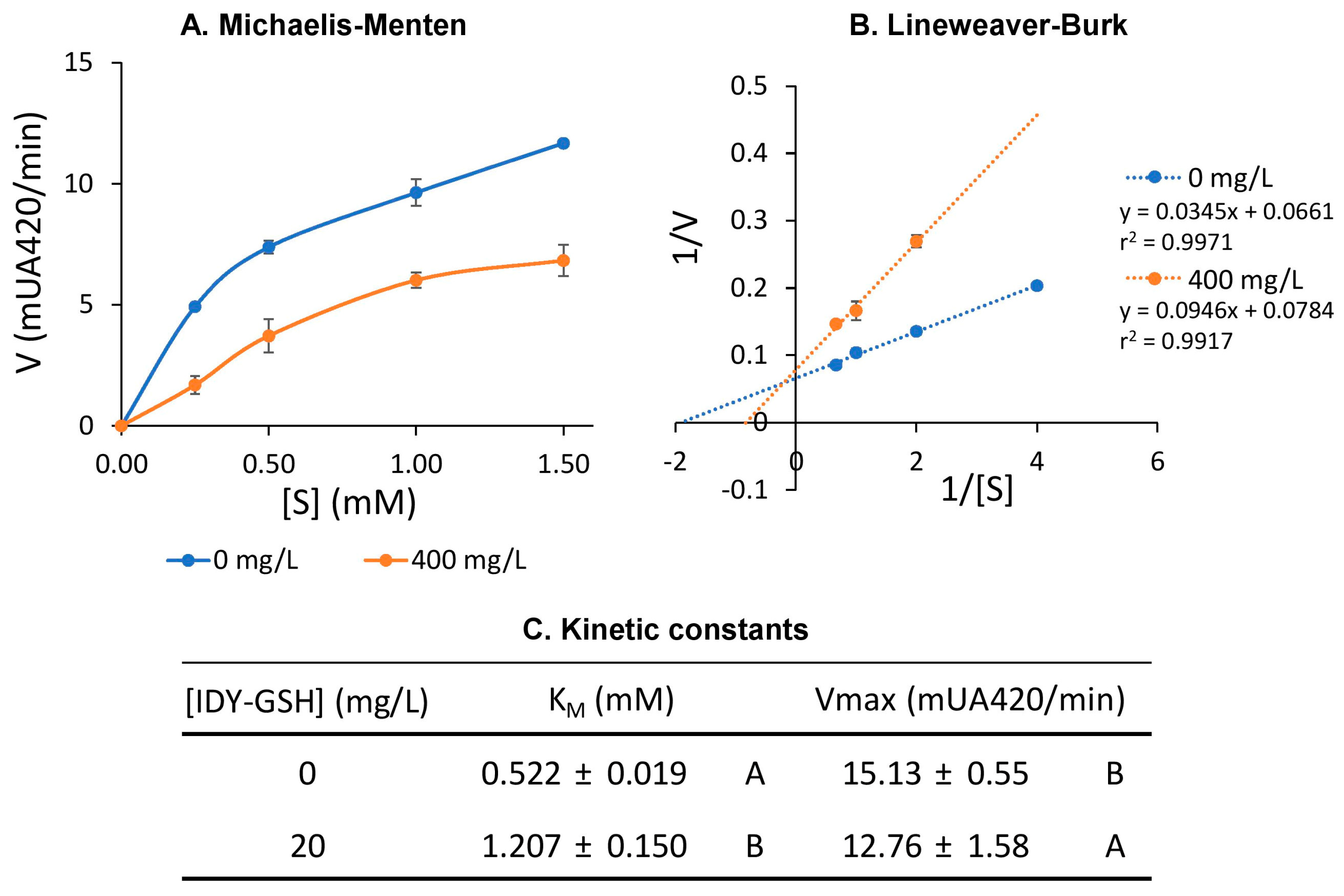 Figure 5 shows the effect of IDY-GSH extract on tyrosinase-induced browning kinetics, analyzed through Michaelis–Menten (Figure 5A) and Lineweaver–Burk (Figure 5B) plots, in comparison to control conditions without any inhibitor supplementation.