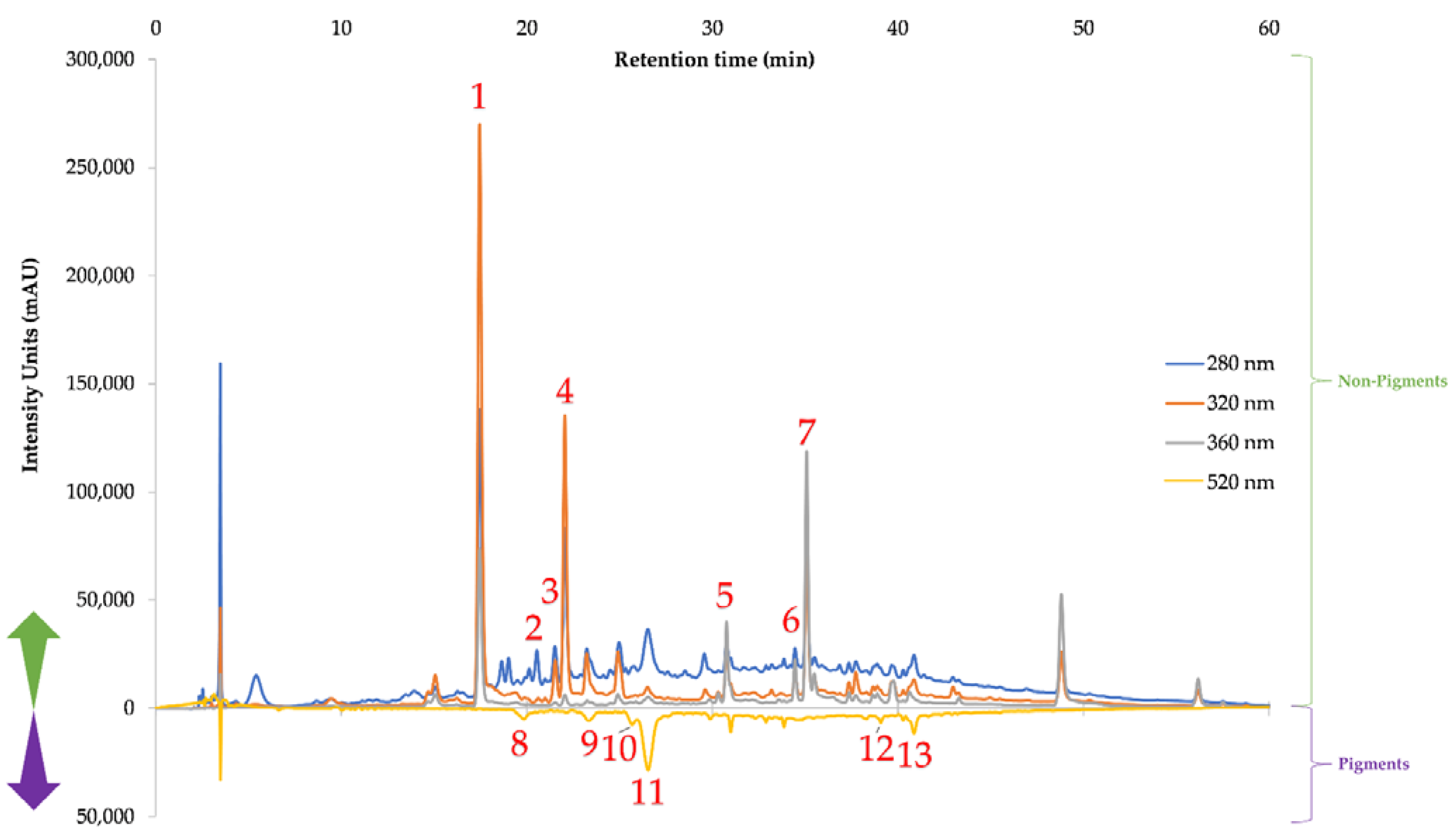 | Total Identified Non-Pigments | 242.13 ± 9.93 b | 178.97 ± 7.77 c | 282.79 ± 15.2 a | 162.01 ± 8.98 c,d | 134.95 ± 7.2 d | 254.47 ± 14.43 a,b | |