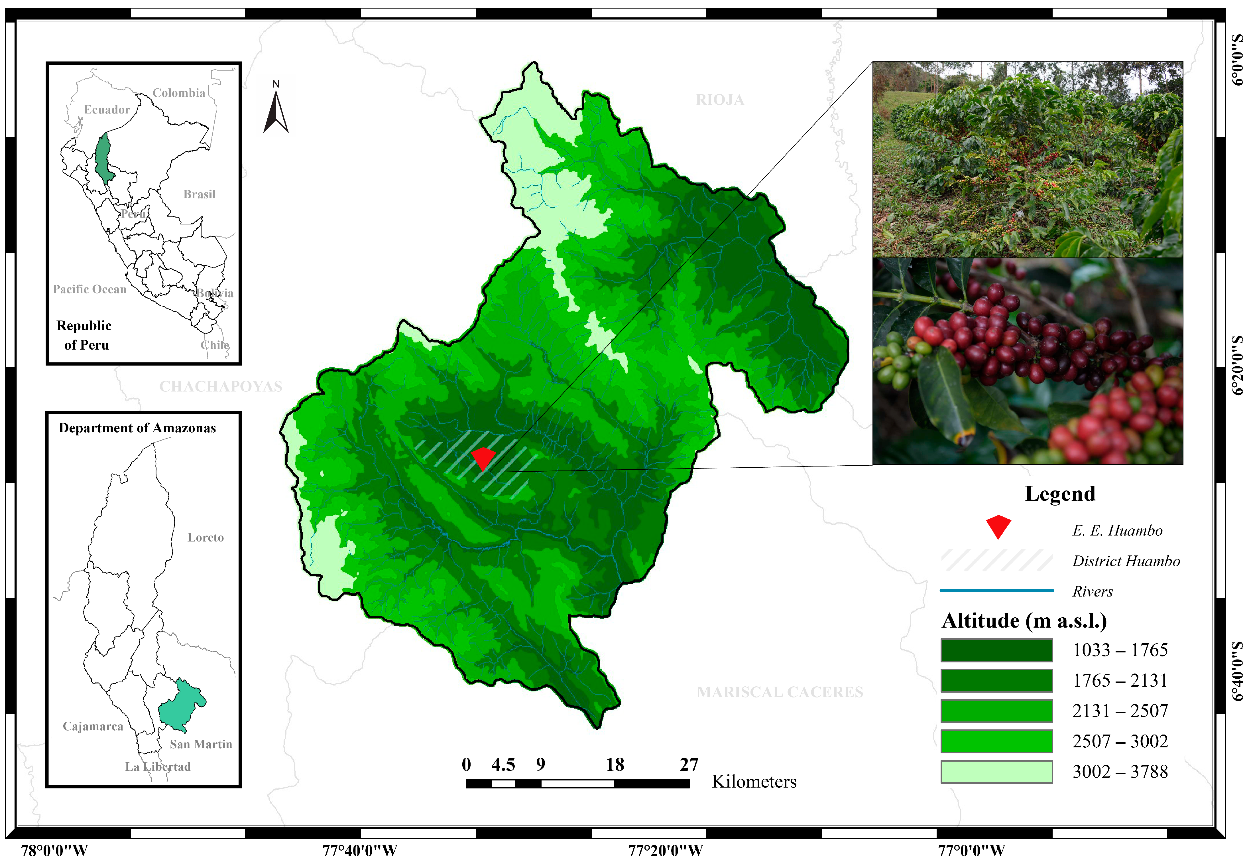 This research was funded by the project SNIP No. 352439/CUI No. 2314883, “Creación de los Servicios del Centro de Investigación, Innovación y Transferencia Tecnológica de Café (CEINCAFÉ)”, implemented by the Instituto de Investigación para el Desarrollo Sustentable de Ceja de Selva, Universidad Nacional Toribio Rodríguez de Mendoza de Amazonas, Peru. Additional support was provided by its Vice-Rectorate for Research.