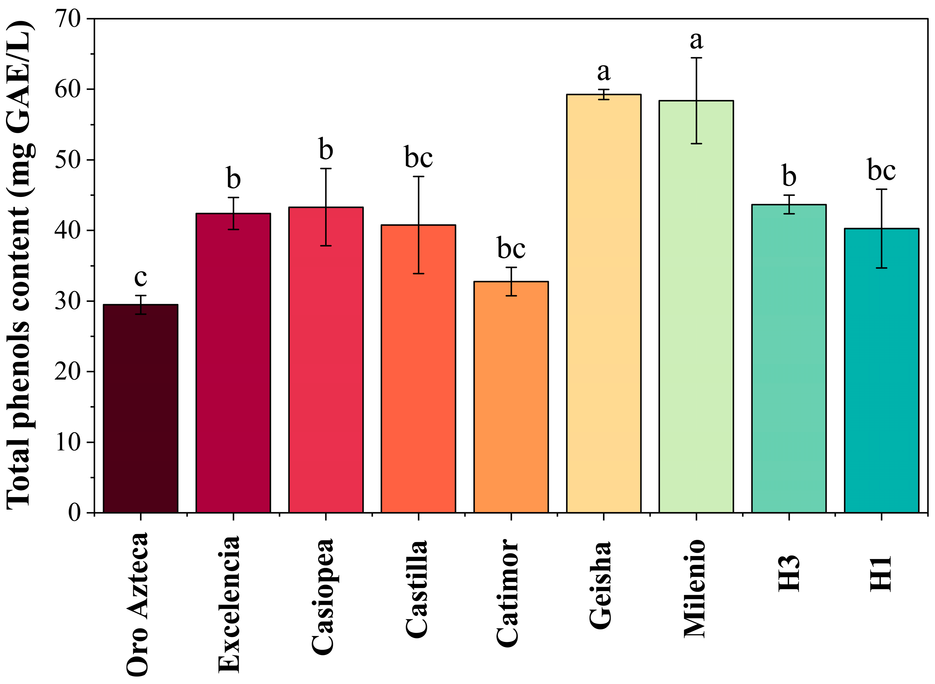 The pH of the infusions ranged between 5.36 ± 0.02 and 6.42 ± 0.02. The CP from the Casiopea variety presented the highest value (6.42 ± 0.02), while H3 showed the lowest (5.36 ± 0.02). These results fall within the range reported for infusions and aqueous extracts of