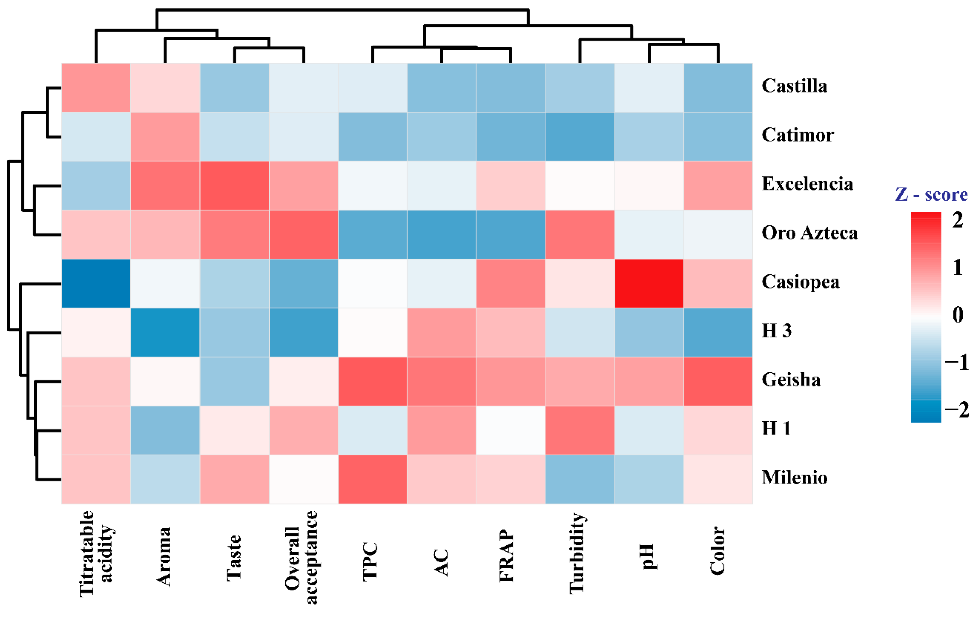 Therefore, this study evaluated the physicochemical characteristics, AC, and sensory acceptance of infusions prepared from the pulp of nine C. arabica L. varieties (Catimor, Castilla, Milenio, Casiopea, H3, H1, Excelencia, Geisha, and Oro Azteca). The objective is to identify the varieties with the greatest potential for use as a functional beverage and to contribute to a circular-economy approach in the coffee production chain.