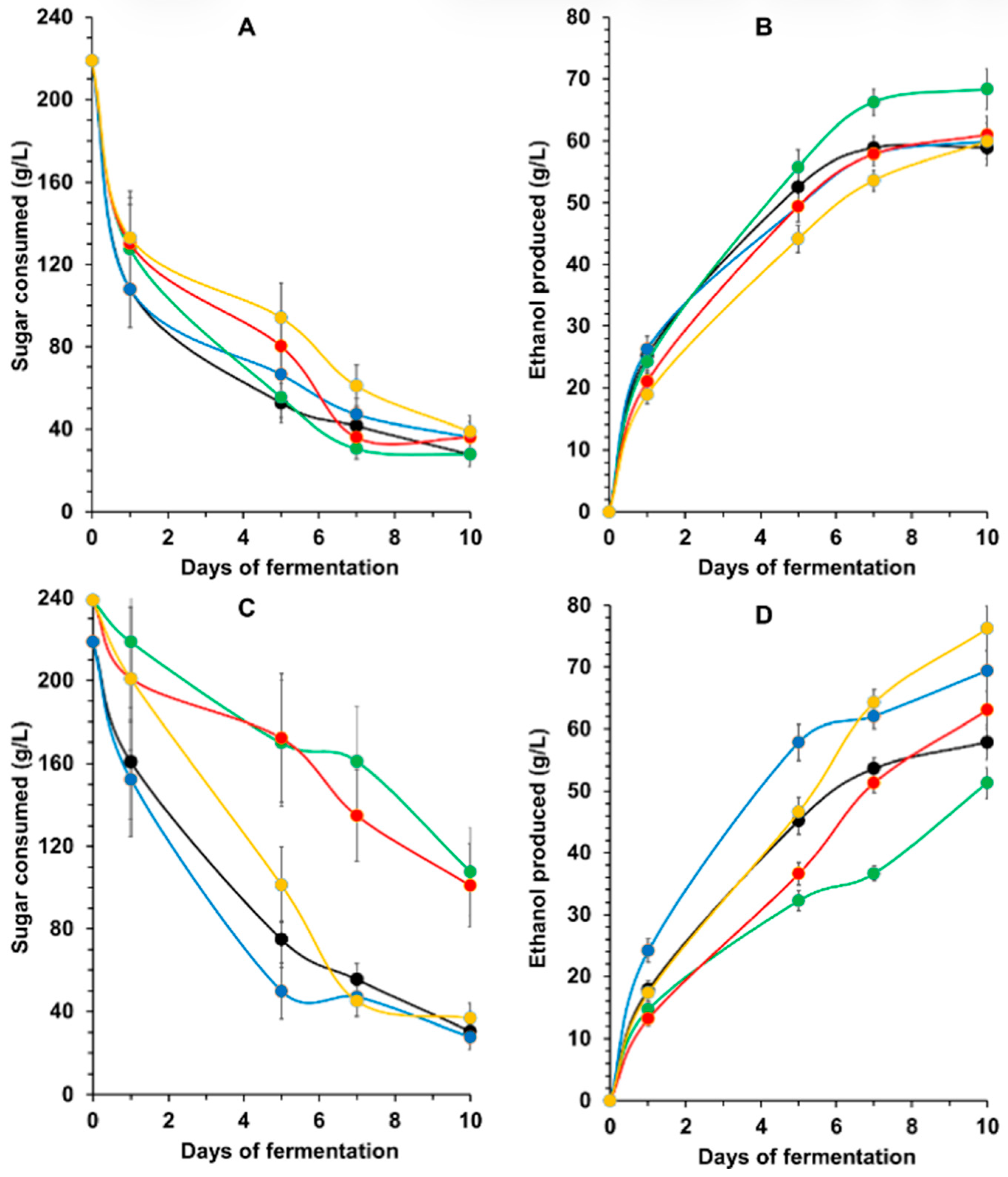 3.1. Fermentative Potential of Industrial Yeast Strains
