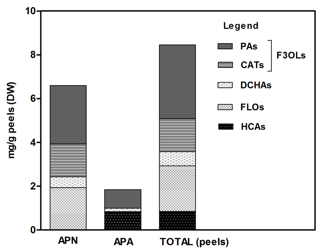 Phenolic composition of neutral (APN) and acidic (APA) phenolic extracts from apple peels. CATs, catechins; PAs, proanthocyanidins (oligomers, up to four units); F3OLs, flavan-3-ols; DCHAs, dihydrochalcone derivatives; FLOs, flavonol glycosides; HCAs, hydroxycinnamic acids and derivatives.