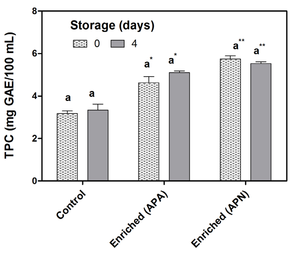 Total phenolic content of tomato juice with added phenolic extracts (neutral APN; or acidic APA) compared to control at time 0 and after four days of storage. Different letters within the same type of juice indicate significant differences between storage times (p < 0.05). An asterisk indicates a significant difference between the enriched sample (APA) and the control sample at the same storage time; a double asterisk indicates a significant difference between the enriched sample (APN) and the control at the same storage time. TPC, total phenolic content; GAE, gallic acid equivalents.
