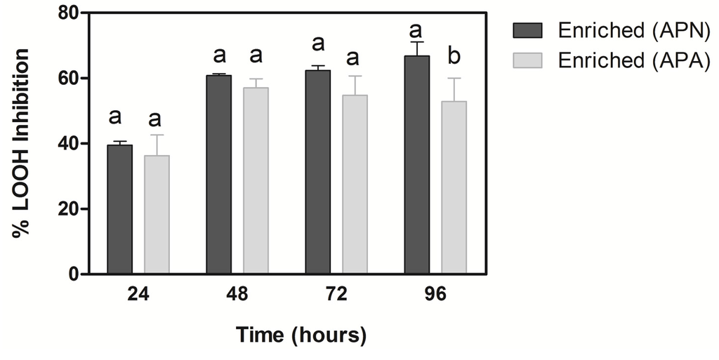 Inhibition of lipid peroxidation over time in a model emulsified lipid with enriched tomato juice added with phenolic extracts. APN, neutral phenolic extract; APA, acidic phenolic extract. Different letters in the same time slot indicate significant differences between extracts.