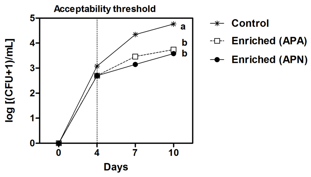 Total viable counts of tomato juices with added phenolic extracts (neutral, APN; acidic, APA) compared to control during the storage time of 10 days at 4 °C. The acceptability threshold at day 4 is indicated with a dotted line. Different letters indicate significant differences (p < 0.05) between samples. CFU, colony forming unit.
