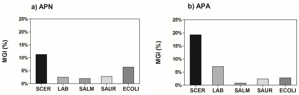 Microbial growth inhibition (MGI%) of selected foodborne pathogens and food spoilage microorganisms in the presence of apple peel phenolic extracts (APN, neutral phenolics; APA, acidic phenolics) with final concentration of 200 mg GAE/L. SCER, Saccharomices cerevisiae; LAB, Lactobacillus plantarum; SALM, Salmonella typhimurium; SAUR, Staphylococcus aureus; ECOLI, Escherichia coli.