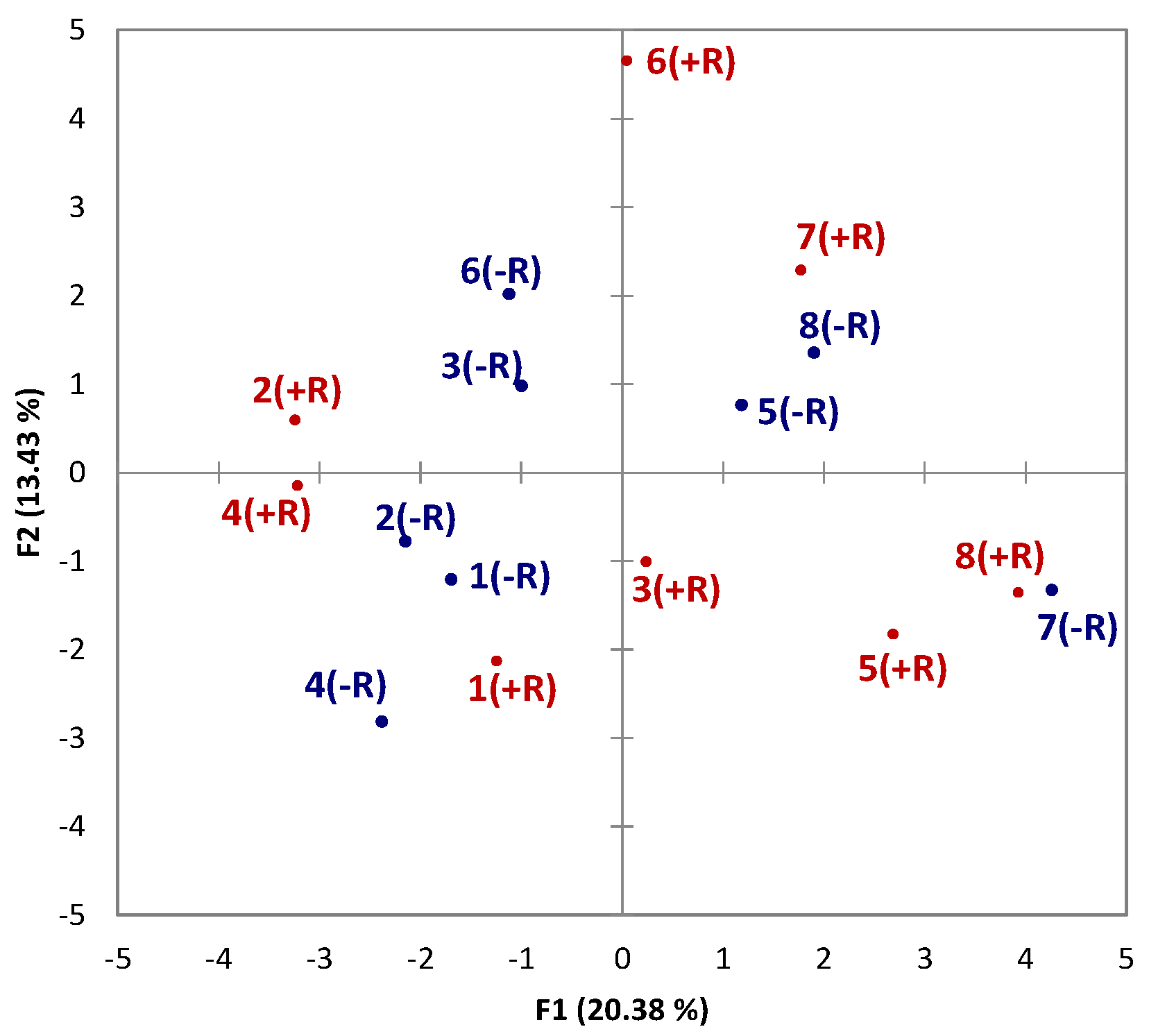 Agglomerative Hierarchical clustering was used to show consistency of panelists with the replicate wines (Figure S1). All wines but one were consistently grouped using napping® for both +R and −R. However, the wines that were not consistently grouped were different between the two analyses. For +R analysis, Treatment 8 was grouped with both Treatment 2 and with Treatment 4 wines. For −R analysis Treatment 1 wine was grouped with both Treatment 3 and 4 wines. This inconsistency was due to results from one panelist that did not group replicates together. This individual’s data were excluded from further analysis.