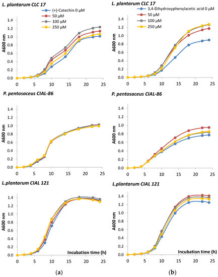 In order to look more deeply into the effects of wine phenolic compounds and their metabolites on bacteria performance, the growth of the probiotic strain L. plantarum CLC 17 and the two oenological LAB strains P. pentosaceus CIAL-86 and L. plantarum CIAL-121 was monitored in the presence of (+)-catechin, a main phenolic compound present in wine, and 3,4-dihydroxyphenylacetic acid, a microbial-derived phenolic metabolite whose concentration in faeces had been reported to significantly increase after moderate consumption of red wine [12]. Time-course graphs indicated a certain stimulatory effect of the growth of the three strains in the presence of 3,4-dihydroxyphenylacetic acid (Figure 1). On the other hand, the monomer (+)-catechin only promoted the growth of L. plantarum CLC 17 (Figure 1). Results of the one way analysis of variance (ANOVA) and Tukey test (at p < 0.05) did not show significant differences in the most of the mean values, except in the case of the L. plantarum CLC 17 in the presence of 3,4-dihydroxyphenylacetic acid (50, 100 and 250 µM) in comparison to the absence of the compound, from 6 to 24 h (Figure 1b). Therefore, our results confirmed that the chemical structure of polyphenols did indeed influence their effects on bacterial growth. In relation to this, other authors observed that flavanols with galloyl moiety ((−)-epigallocatechin, (−)-epicatechin-3-gallate and (−)-epigallocatechin-3-gallate) exhibited more activity on bacteria growth than those without galloyl moiety (catechins and (−)-epicatechin) [29]. Also, the microbial potency of polyphenols towards bacteria growth has also been reported to be dependent upon bacterial strain, species and genera [30], as we have also observed in our study.