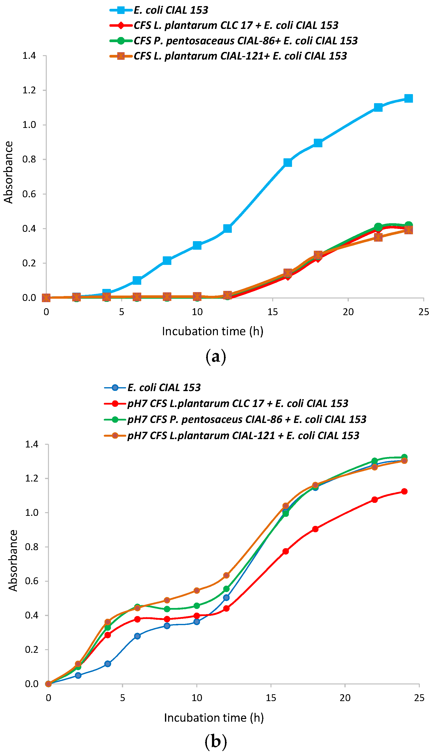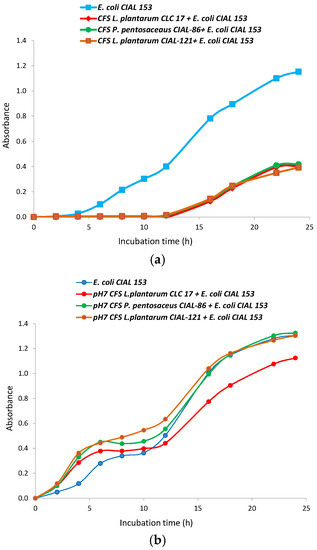 Growth curves of E. coli CIAL-153 in the presence of cell-free supernatants of L. plantarum CLC 17, P. pentosaceus CIAL-86 and L. plantarum CIAL-121 strains before (a) and after (b) being neutralized at pH 7.