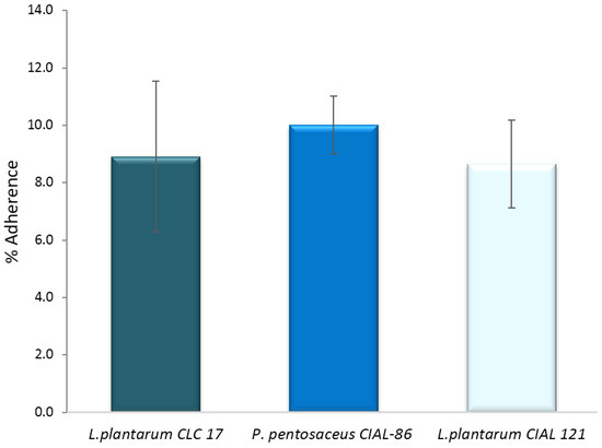 An important property of probiotic candidates is their ability to adhere to intestinal mucosa, which excludes pathogens from cell adherence and infection progression. Initially, we investigated the ability of the three LAB strains (L. plantarum CLC 17, P. pentosaceus CIAL-86 and L. plantarum CIAL-121) to adhere to human intestinal Caco-2 cells because this cellular model expresses morphological and functional differentiation in vitro and shows characteristics of mature enterocytes. Adhesion levels to Caco-2 cells of the three LAB strains ranged from 8.65% to 10.01% (Figure 3) and were in line with those obtained previously [4] and in the range of other probiotics previously reported in the literature under in vitro conditions [35,36].