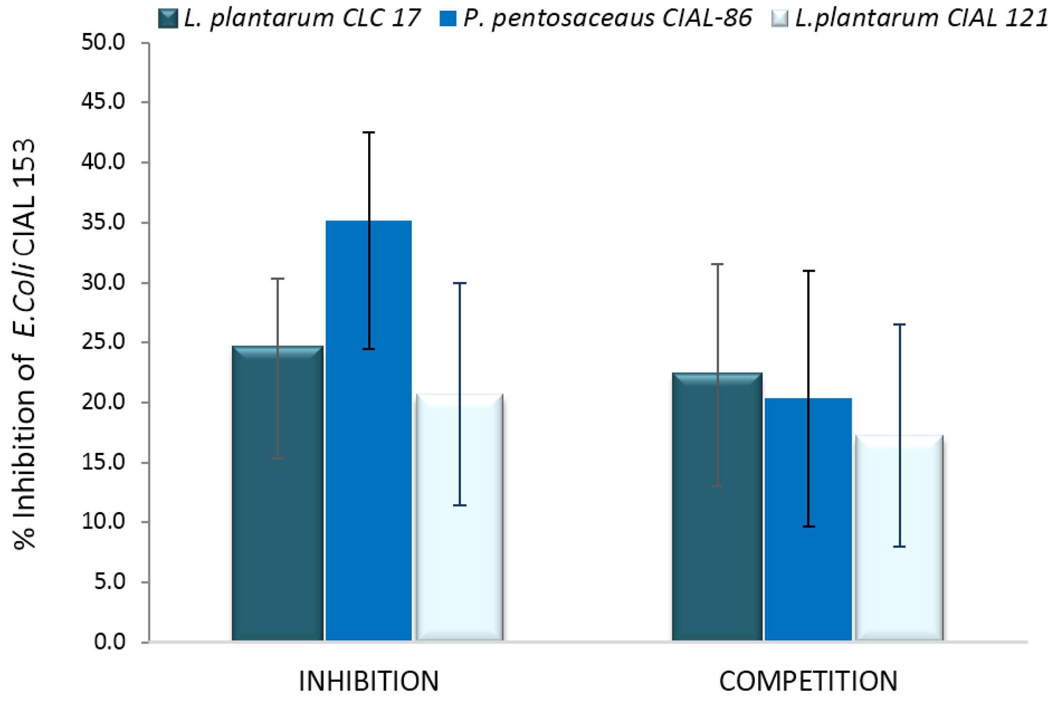 Inhibition (%) of adherence (%) of E. coli CIAL-153 to Caco-2 cells in the presence of L. plantarum CLC 17, P. pentosaceus CIAL-86 and L. plantarum CIAL-121 in anti-adhesion assays (competition and inhibition). Results are shown as media ± standard deviation.