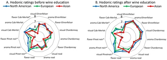 Mean hedonic ratings (degree-of-liking, max. = 9) before (A) and after (B) 12-weeks of wine education/training, for North American, European and Asian consumers. Means identified with an asterisk (*) are significantly different (p ≤ 0.05) according to Kruskal Wallis tests followed by Mann-Whitney tests. Tests were conducted on each wine characteristic (visual, aroma, flavor) for each of the five wines. The minimum and maximum axes values were specified as four and eight, respectively, to aid in visualization.