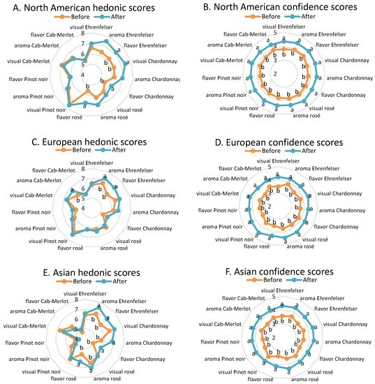 Mean hedonic ratings (degree-of-liking, max. = 9) and mean confidence ratings (degree-of-sureness, max. = 5) for North American (A,B), European (C,D) and Asian (E,F) consumers, before and after 12-weeks of wine education/training. Means identified with different superscripts (a,b) are different (p ≤ 0.05) according to the Wilcoxon Signed Rank test. Tests were conducted on each wine characteristic (visual, aroma, flavor) for each of the five wines.