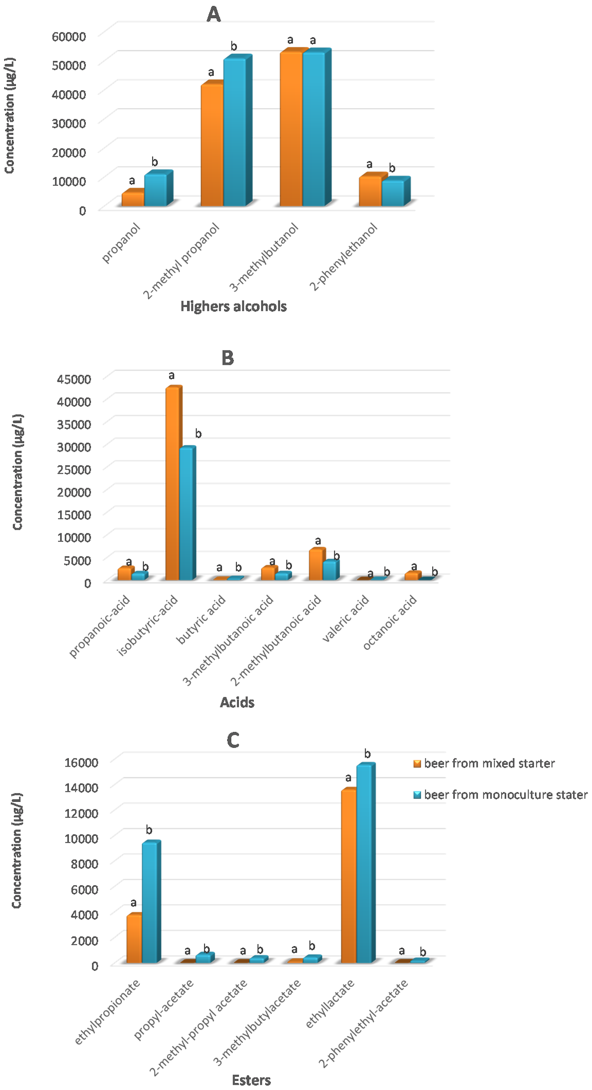 | Acetic acid (mg/L) | 21.0 ± 0.1a | 0.0b | 0.0b |