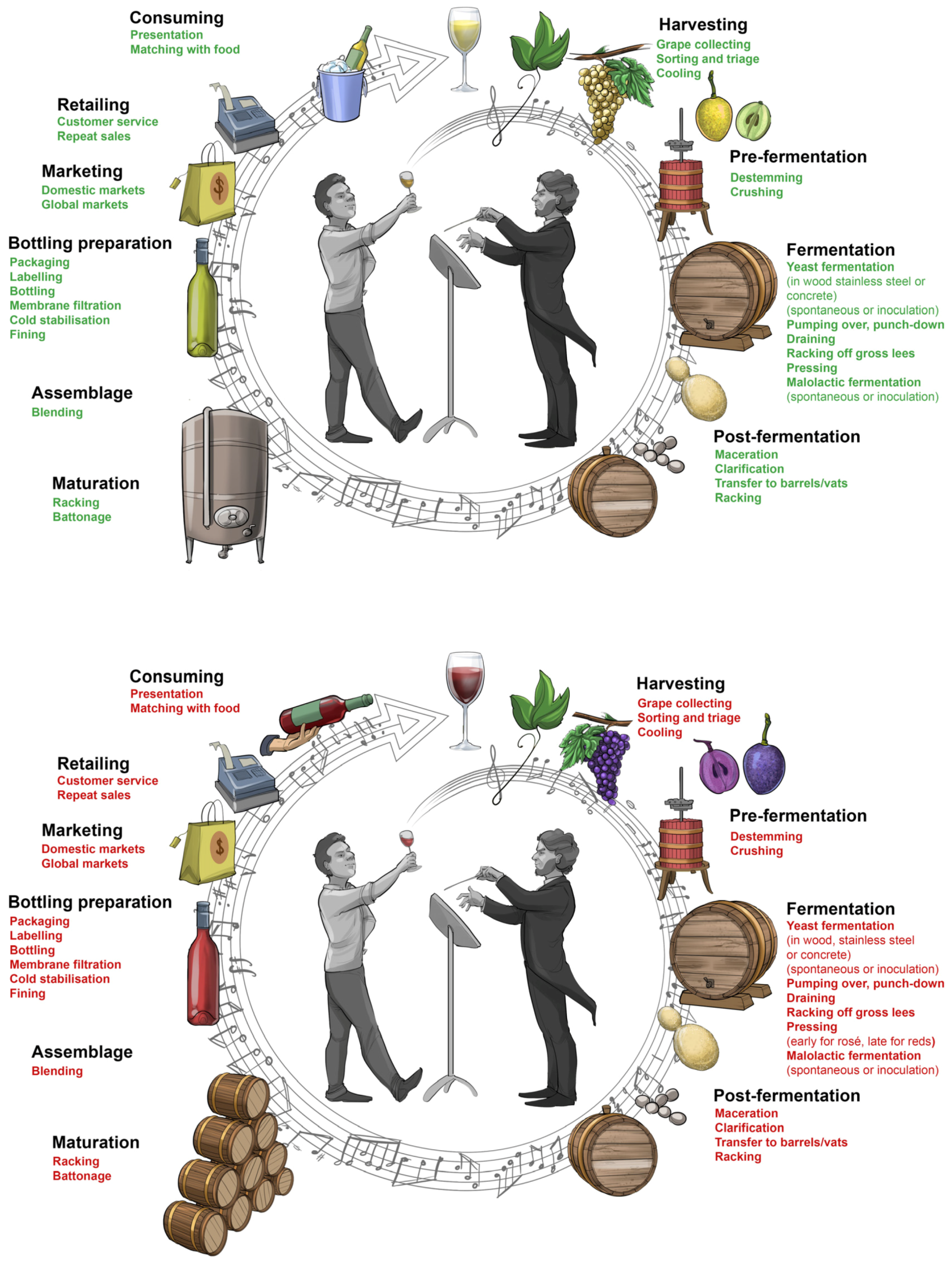 Figure 7). However, there are variations and deviations along the way that enable winemakers to put their own individual stamp on the production chain, thereby making their wine unique (for further reading see [