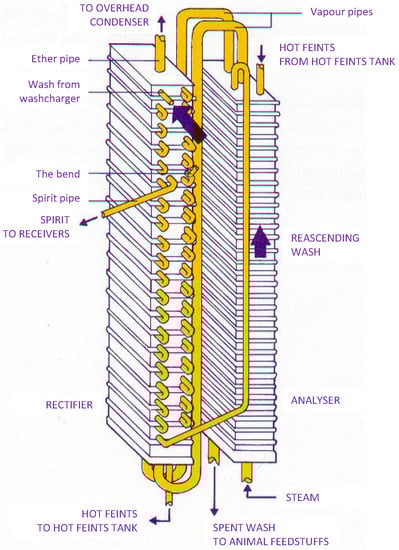 Unlike malt whisky, Scotch grain whisky is produced in a Patent or Coffey Still in a continuous process. A Coffey still consists of two parts—an analyser and a rectifier (see Figure 4). The wash is pumped in at the top of the rectifier where it is warmed as it flows down a coil in the column. The warm wash then enters the top of the analyser and descends through a series of perforated plates. Low pressure steam is pumped in at the bottom of the analyser which rises up through the plates extracting alcohol vapours taking them to the bottom of the rectifier column. As the alcohol vapours rise up through the rectifier they are condensed on trays by the cool wash coils and the grain spirit is removed from the column towards the upper end, typically around 6 trays from the top.