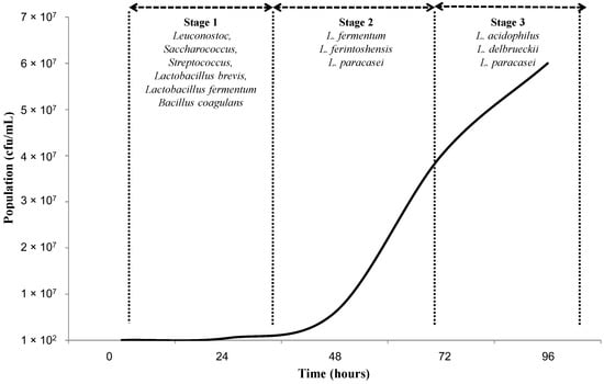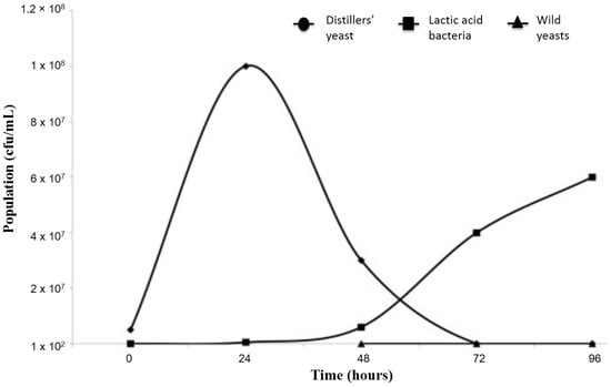 In large-scale whisky distilleries, spontaneous fermentations are not conducted and freshly propagated or commercially supplied pure-cultured yeasts are inoculated (pitched) into distillery fermenters as cultures of Saccharomyces cerevisiae. Nevertheless, other microorganisms are present during whisky fermentations due to the lack of a wort boiling stage and it is recognised that limited bacterial activity is an essential part of the craft of malt distilling [4,5]. For example, lactic acid bacteria (LAB) and Leuconostoc spp., if present, can produce lactic and acetic acids, which may be esterified to produce ethyl lactate/acetate, respectively, which impart sweet, fruity, creamy, and pineapple-like flavours [6]. Lactic acid bacteria are also responsible for the formation of γ-dodecalactone which imparts a “sweet and fatty” characteristic to the spirit [7]. The evolution of LAB during whisky fermentation is depicted in Figure 5, where it can be seen that initially diverse bacterial populations gradually decline to give way to selected homofermentative LAB strains capable of surviving on nutrients liberated by dying yeast cells.
