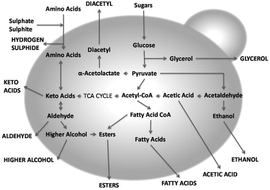 This yeast will readily ferment the sugars made available in wort following saccharification of cereal starches using malt or exogenous enzymes. The major products of this fermentative metabolism by yeast are ethanol, carbon dioxide and glycerol, and the minor compounds are a host of others including esters, aldehydes, higher alcohols, organic acids, diketones, sulphury and phenolic compounds (see Figure 7).