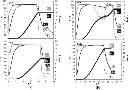Time-temperatures graphs and values of pasteurization A (top) and B (bottom) lots: (a) apple-RCW, strawberry-RCW, and blueberry-RCW beverages; (b) pear-RCW beverage. Tair refers to autoclave; TP1 refers to the core of bottles put at the top of autoclave’s chamber; TP2 refers to the core of bottles put at the bottom of autoclave’s chamber; F1 is the value of the top bottle; F2 is the value of the bottom bottle.