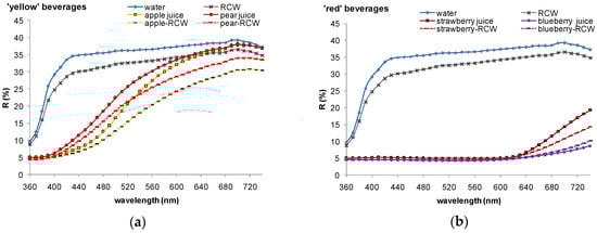 Reflectance spectra of water, ricotta-cheese whey (RCW), commercial pectin-free juices diluted to 14% SSC with water (fruit juice), and beverages before pasteurization (RCW-fruit): (a) apple and pear ‘yellow’ beverages; (b) strawberry and blueberry ‘red’ beverages.